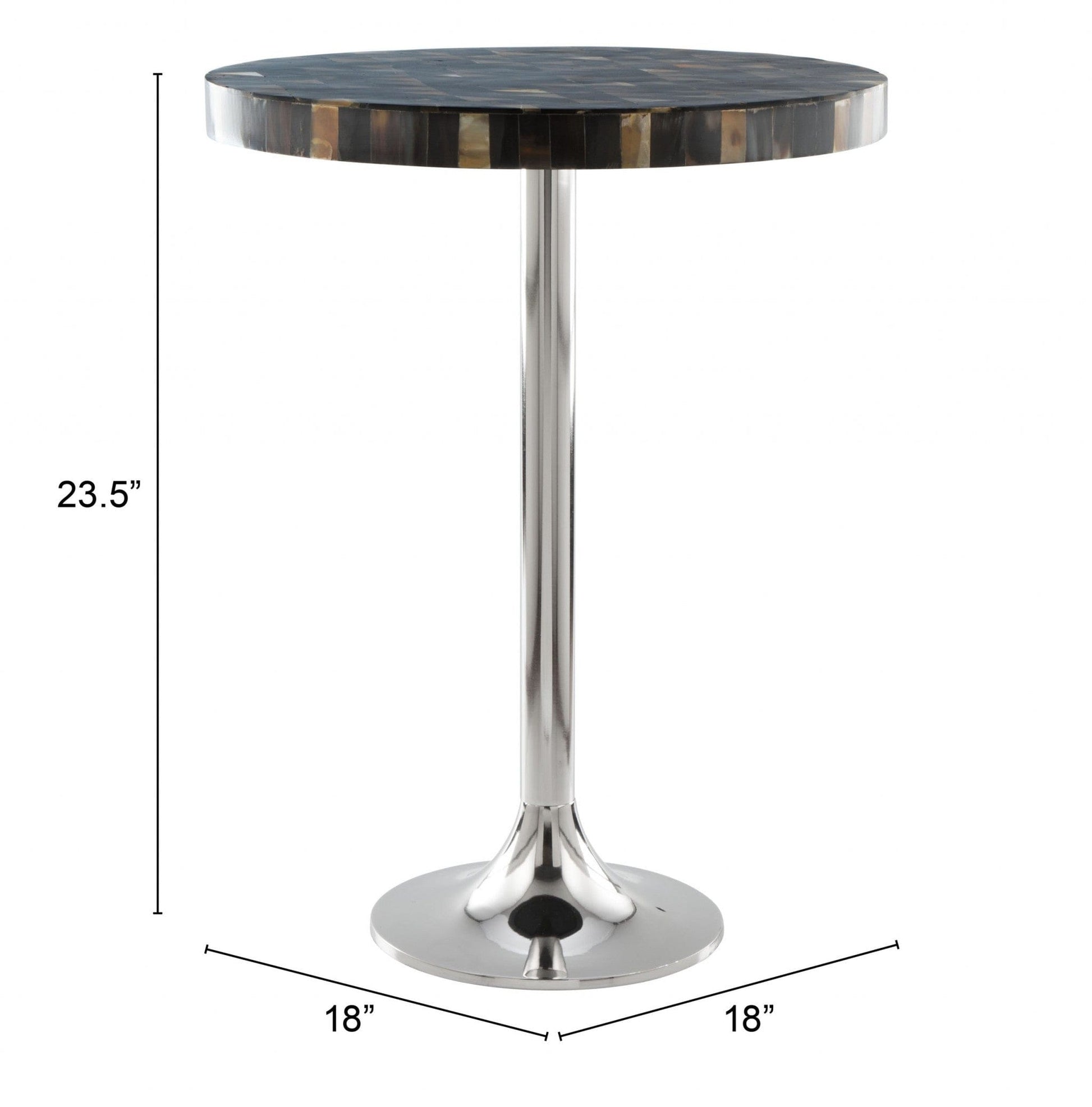 With this Dark Mother of Pearl Round Side Table you can add a pop of neutral color to any space in your home. The pedestal base of the table is made from steel and is colored to a high shine silver finish. The table top is a gorgeous multicolored panel of dark pieces of mother of pearl that mixes ivories blacks grays and browns to create a stunning statement piece. 23.5" H x 15.7" W x 15.7" D