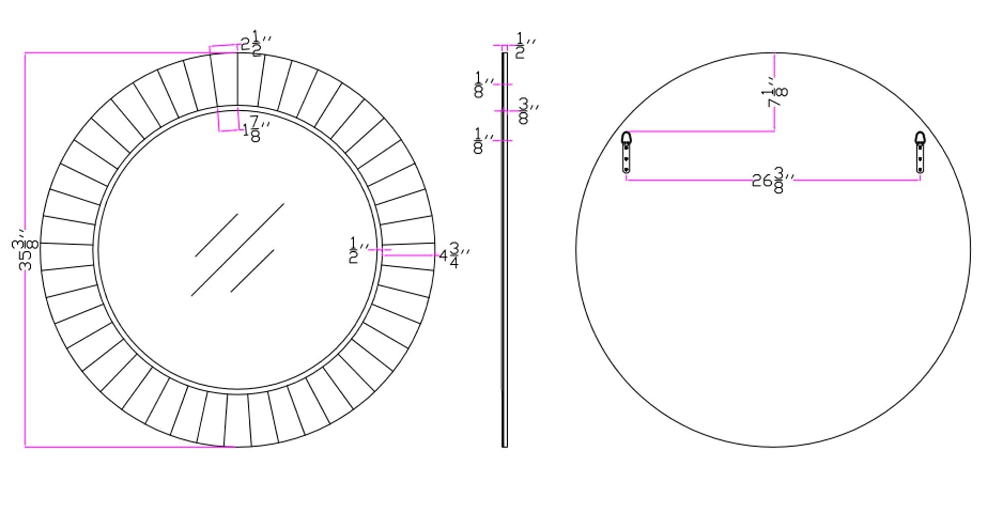 The Daylight Round Wall Mirror has a beautiful sun-like design featuring a fringe of rectangular mirrors encircling the main center mirror. This mirror brings light and life to your home, and will make you in a goold mood when you walk passed it. The geometric edge makes this mirror an object to look at in addition to being functional. Its contemporary aesthetic will blend with bohemian, coastal and modern decor or in any room you would like to see more. This mirror has a high quality silver backing. Ready to hang either vertically or horizontally with pre-attached hanging mounts. 35.375" x 35.375" x 0.5"