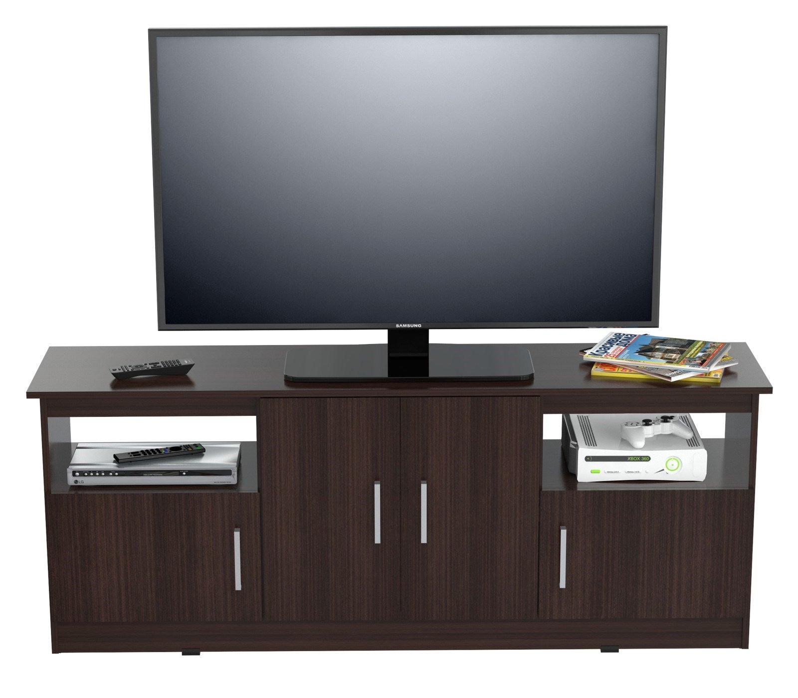 Get yourself a TV stand that's a marvelous mix of quality craftsmanship and practical design. Not to mention how fashionable charming it is as well. Its a classy media center expertly crafted from solid composite wood laminated on all sides in double faced durable melamine, which is stain, heat and scratch resistant. There's no better way to introduce some diversity to your living room. It also balances being generally astounding with being distinctly efficient. Its four storage compartment with door that have metal knobs are the best space to store your DVD collections, home videos, or magazines. Furthermore, this TV stand can accommodate flat screens up to 60 Inches. As for measurements, they are 24.6 Inches for height, 62.9 Inches for width, and 14.1 Inches for depth, and it weighs 63 pounds. It will be the ideal accent for your home, and will make your living room look better simply by being there.