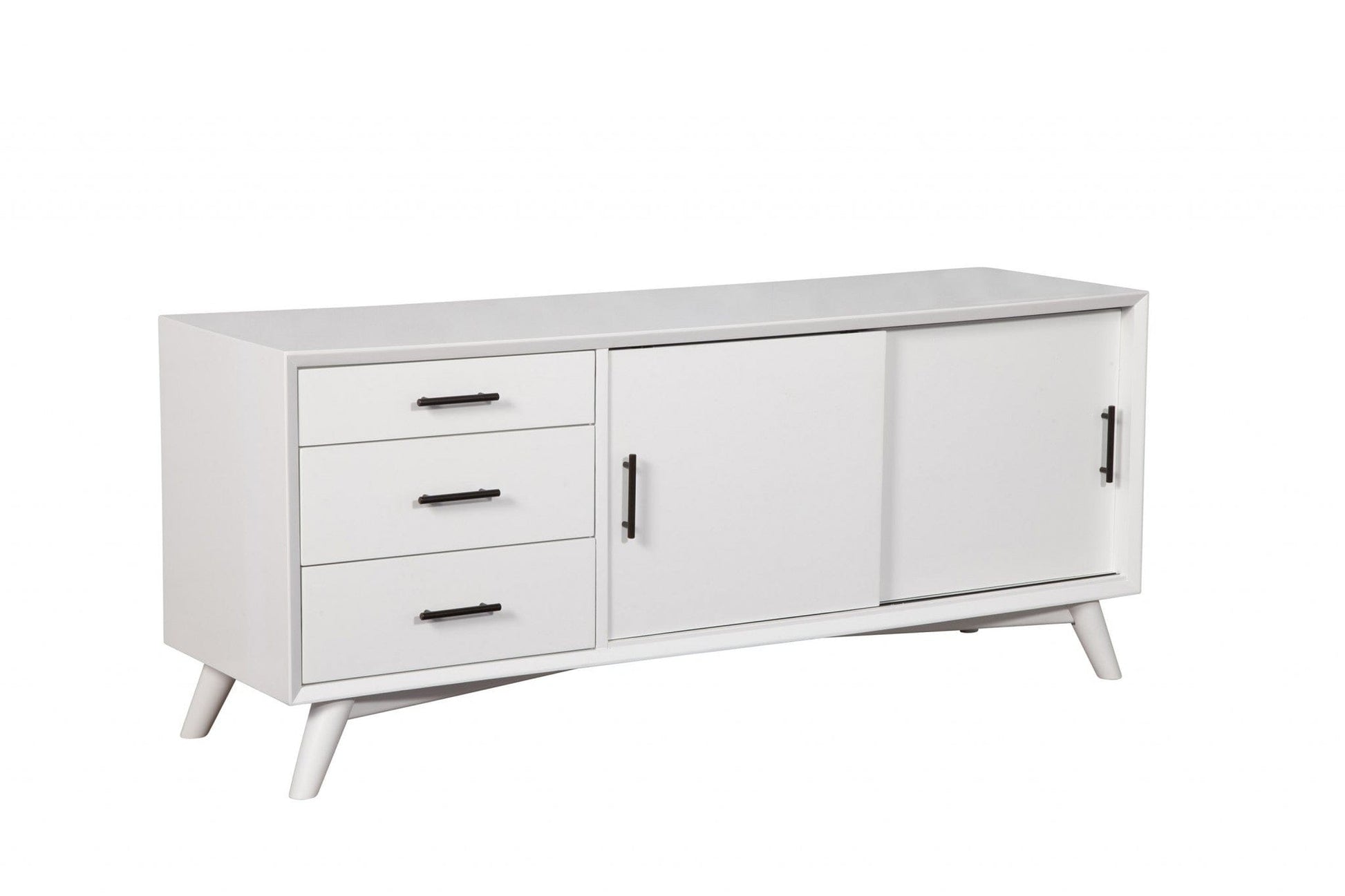 Infuse some Mid Century design sensibility to your interior with this Flair White Mid Century Mod TV Console. Inspired by the popular Mid Century period, this modern piece is made up from the perfect combination of clean lines, minimalist design, and quality materials. The crisp white hue is the perfect timeless look for any interior. This unit includes 3 pull out drawers and a sliding cabinet for lots of storage and organization. The splayed legs give this console a unique look and modern appeal. The high-grade English Dovetail drawer construction adds to the upmarket feel of this unit, giving it a practical as well as gorgeous structure for you to enjoy! 27" x 64" x 19"