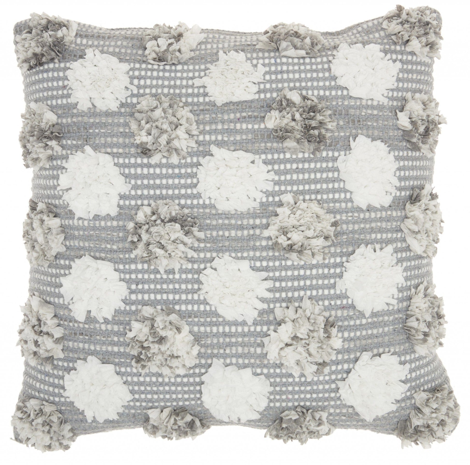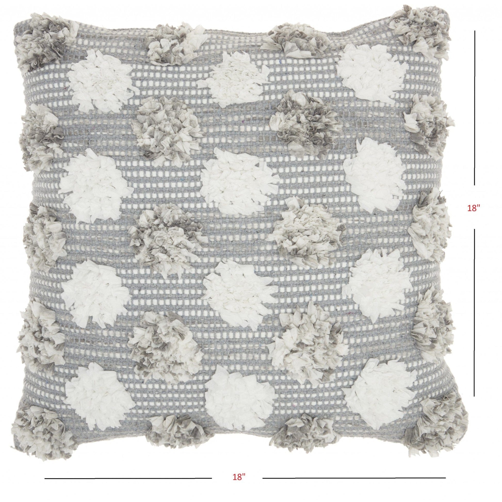 Made with natural jute fabric and filled with a dreamy polyester filling, this Floral Textured Gray and White Throw Pillow has been made with design and comfort in mind. The pillow is covered in a gray and white jute fabric which serves as the perfect background for the textured floral shapes on top. The floral shapes made of soft white and gradient gray fabric lay on top in a horizontal pattern with each line filled with one color. This throw pillow is the perfect way to add texture to your couch, bed, or even your favorite reading chair. 5" H x 18" W x 18" D