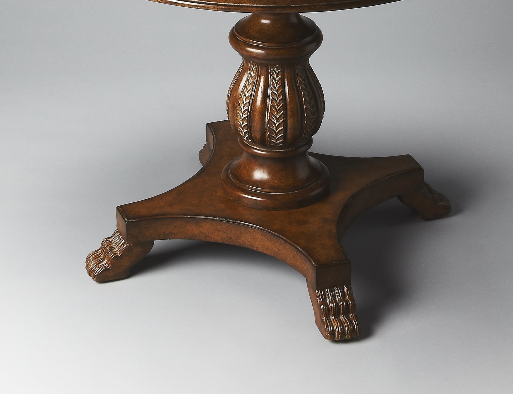 Transition the luxury aspect of your home with this Fossil Stone Accent Hall Table. Splendor in design it has been exquisitely carved with selected resin wood solids, topped with fossil stone veneers and a sunburst inlay. The entire table sits on an urn shaped pedestal that end in paw like feet. Accentuate your living room, den or even place this table in your hallway to create a sense of comfort and richness. 30.5" x 36" x 36"