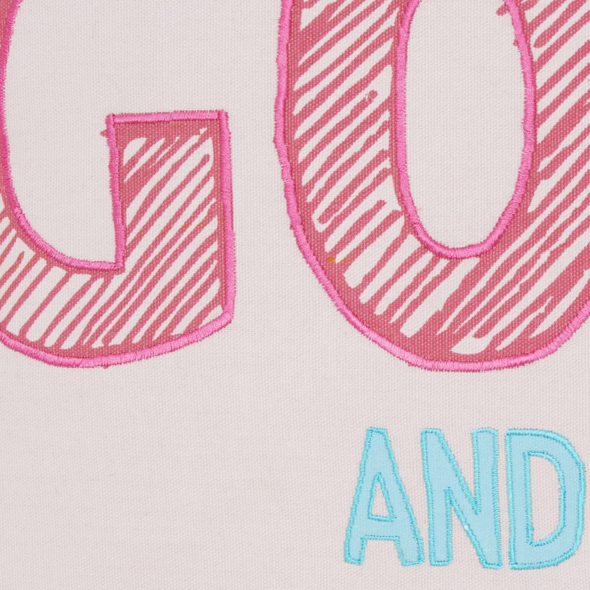 Bring in the perfect touch of style and comfort to your home with this Give It To God And Go To Sleep Throw Pillow. This pillow is in a square shape and is covered in a white colored cotton fabric. On top of this white background there are the words 'Give It To God And Go To Sleep' written on top of it. The word 'God' is written in a striped font in a pink color while the other words are in a blue color. This pillow will add the perfect amount of whimsy to any chair or couch in your home. Use it in your bedroom, your living room or your kids' rooms, the options are endless. 5" H x 18" W x 18" D