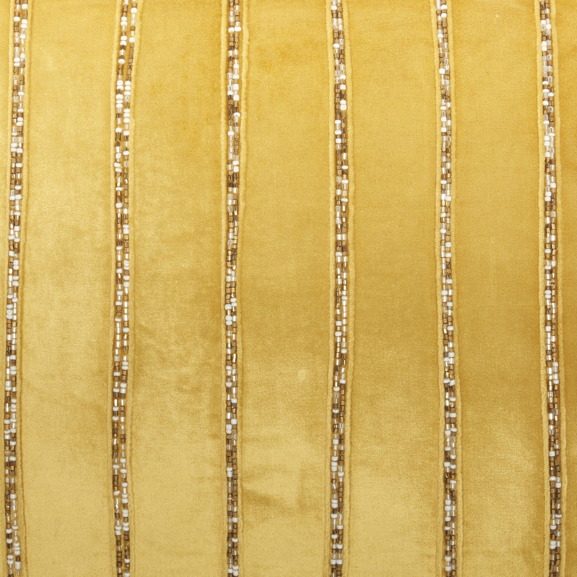 Achieve elegance and glamour in your interior with this Glam Gol and Gold Accent Throw Pillow with Beaded Details. This expertly handcrafted velvet pillow is the perfect piece to scatter on your sofa or bed with its added detail of beaded strands running along the front cover. The modern gold velvet cover provides an extra softness and luxurious aesthetic to the pillow. The zipper closure feature allows for easy inner interchangeabilty, making this pillow a practical and glamorous must-have! 5" x 20" x 20"