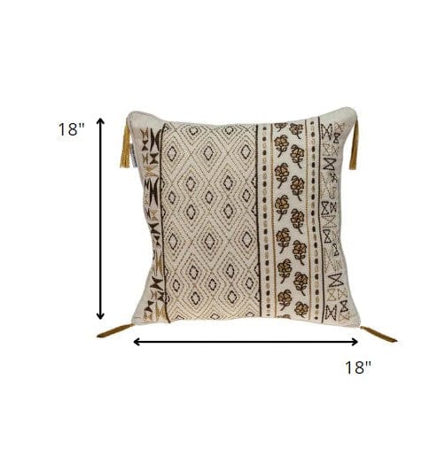 Exquisitely redefining elegance and comfort, the Gold and Bronze Embroidered Decorative Throw Pillow is a flawless creation. Flaunting four gold tassels on each corner, the entire pillow is covered with a gold and bronze embroidery pattern that features a classic textured experience combined with comfort. While the front of the pillow portrays quintessential designed stiches, the back is adorned with a delicate floral print that also conceals a hidden zipper under the flap over a 100% cotton canvas. Distinguished and comfortable, this throw pillow makes a great addition to your home. 18" x 18" x 4"