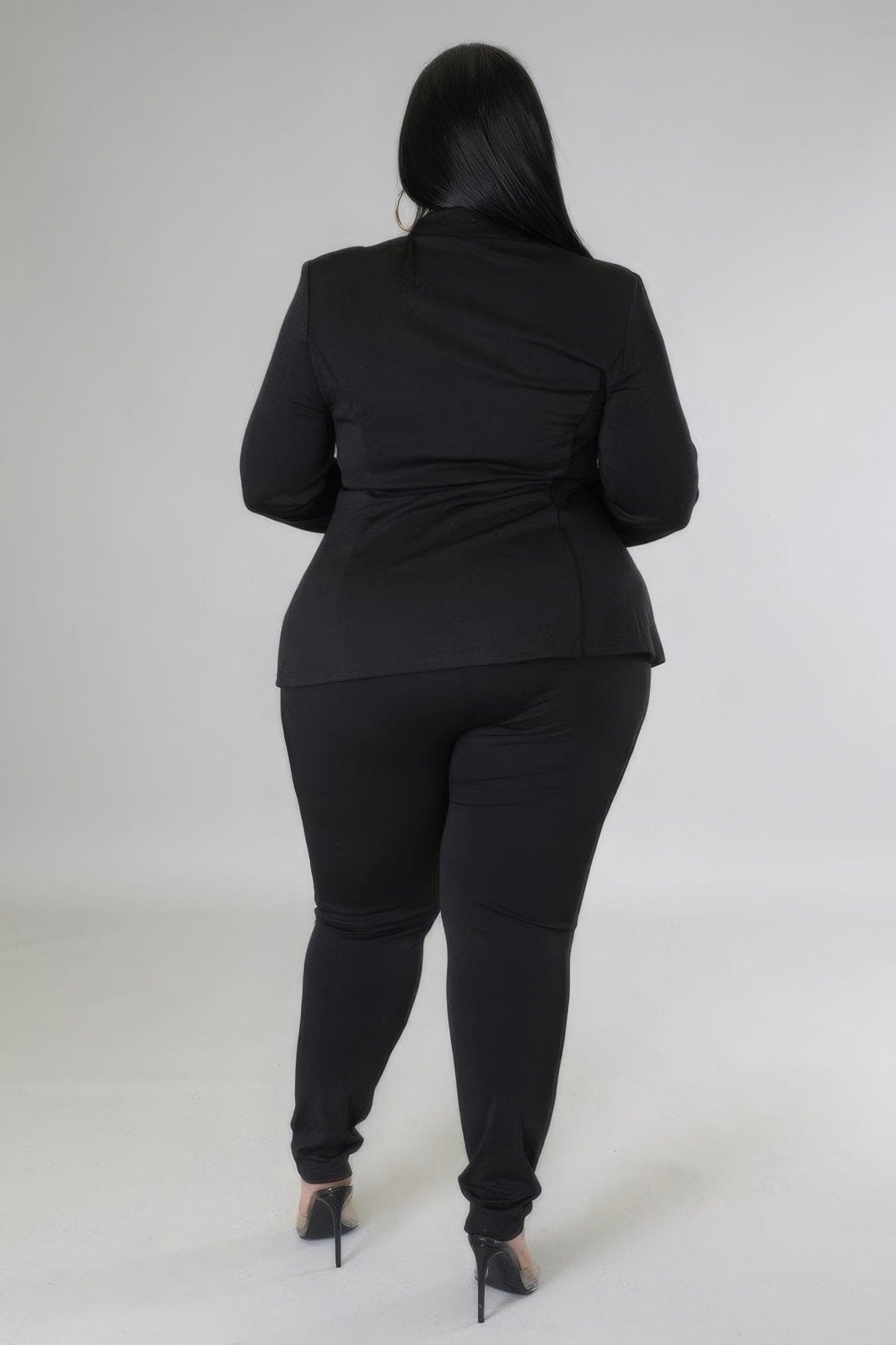 Introducing our Two-Piece Set in elegant Black, available in sizes 1XL, 2XL, and 3XL. This set features a stretch top with a collar, long sleeves, faux pockets, and sheer details, paired with high-waisted pants boasting a zipper closure. Crafted from a blend of 95% Polyester and 5% Spandex, this ensemble ensures both style and comfort.
