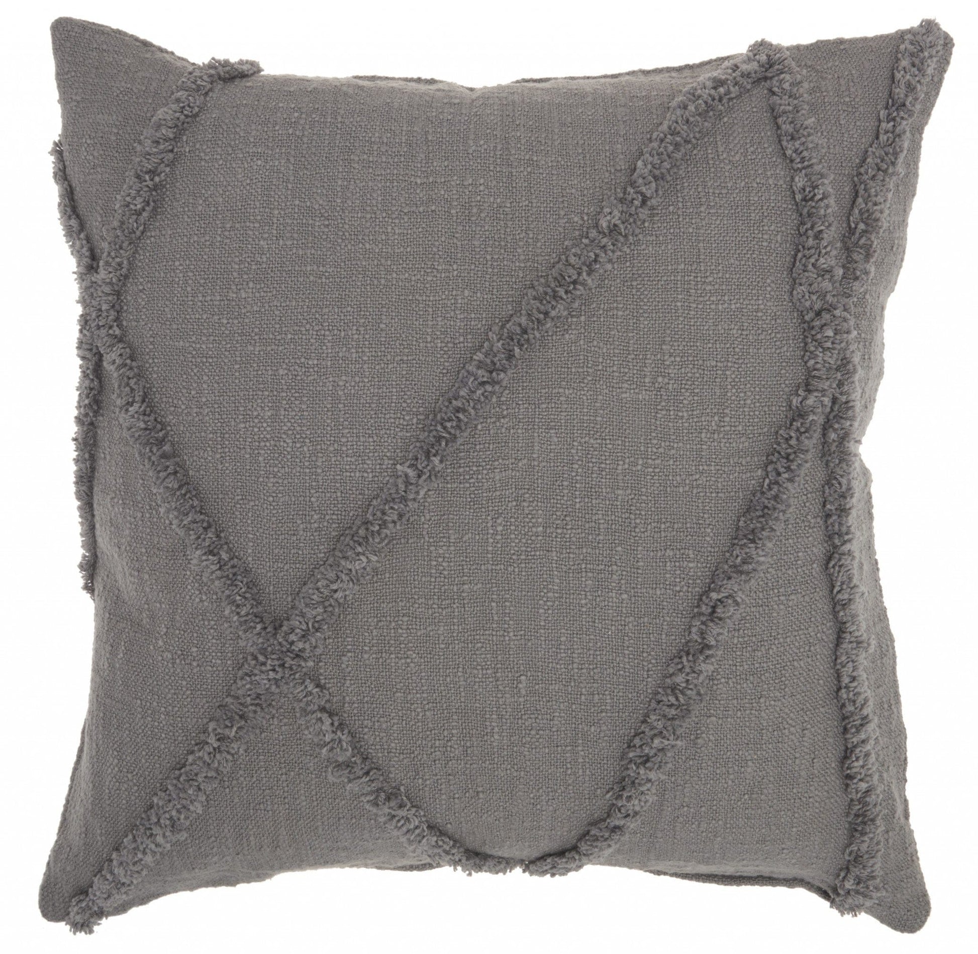 With this Gray Shaggy Detail Throw Pillow you can add the perfect mix of design and comfort to your home. This pillow has a square shape and is covered in a textured gray colored fabric. On top of this fabric there are shaggy thread lines in a geometric pattern that are in the same gray color. The same colored details add a touch of depth and dimension to the overall look of this pillow and will elevate any seating space in your home. You can use this pillow to style up your bed, your couch, or any other seating area in your home and it will work with any existing colors or decor styles you may already have. 5" H x 24" W x 24" D