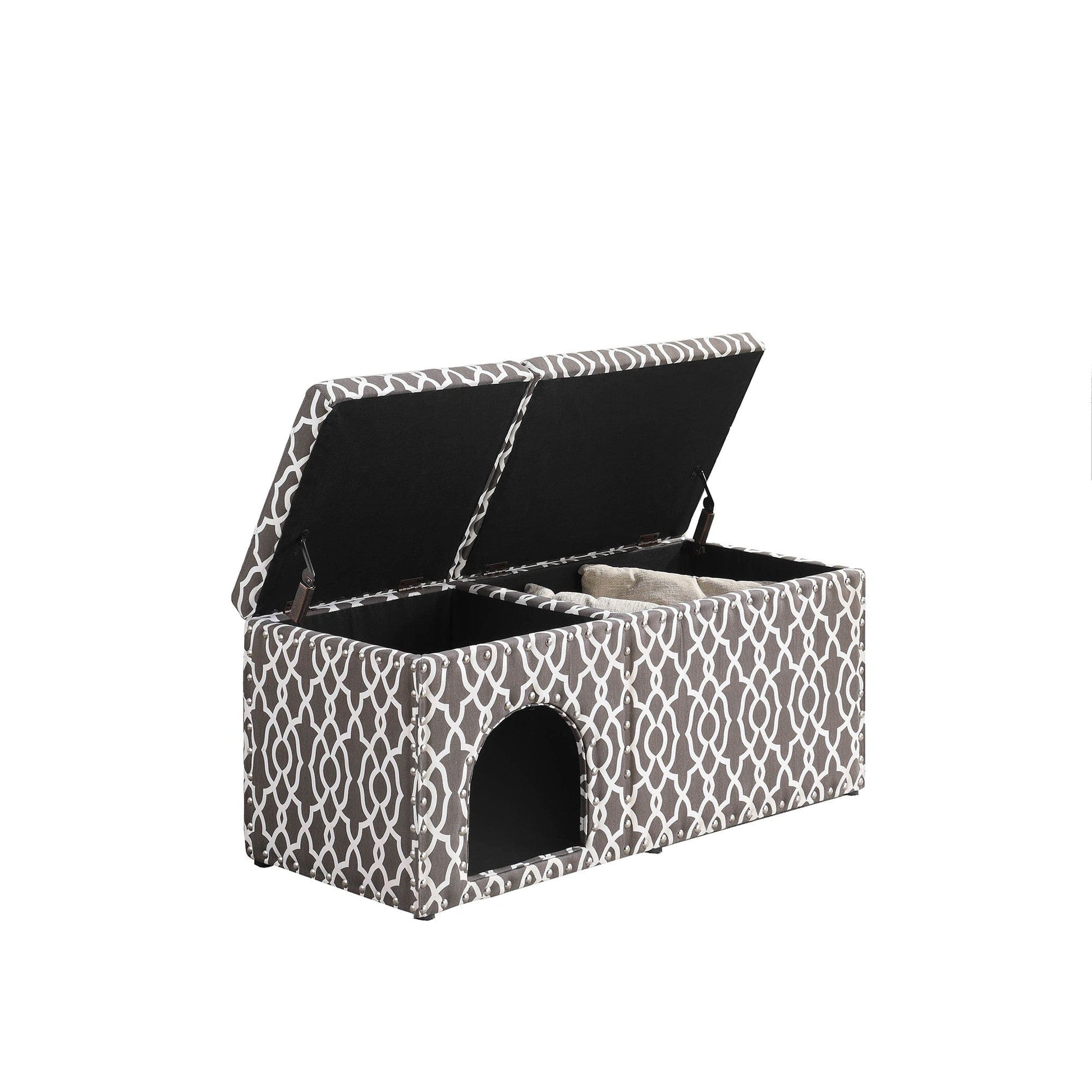 This unique and versatile Lattice Storage Bench with Pet Bed emphasizes comfort and functionality that both you and your pet will love! This versatile piece can be used as an ottoman, a coffee table, a storage bench, or simply a pet house and pet storage option. Designed with a "dog house" style arched opening your small pet can easily move in and out. The top opens for you to put additional padding or bed inside for your pet to lay on. The other side is a bench that you can use to sit and or store pet products or any accessories. Your cat or dog can enjoy their own private hideaway at the bottom of the bench. Both tops feature a pull-up mechanism. Made with a wooden frame, nailhead grommet trim, and a good looking neutral design, this bench is made to be sturdy and super durable. 18"H x 40" W x 17" D