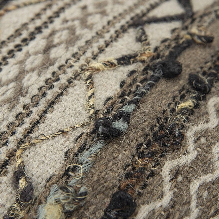 Meet your unique taste of style and décor with this exquisitely designed Gray Jacquard Linear Textured Throw Pillow. Featuring a collage of recycled fibers in soft shades of gray and beige, the linear texturing and jacquard weaved fabric adds a tribal influence to the pillow with a traditional appeal. The strands of corded lace with stitched embellishments add a beautiful texture to the pillow and the uniquely hand-picked recycled fiber makes it a one-of-a-kind decorative accent to adorn your home. Crafted from a blend of wool and polyester for long-lasting durability and luxurious softness that will lend an inviting feel to the pillow. The pillow features a solid back and clean-lined edging for a modern flair, while the neutral hues are meant to tie together the aesthetics of any traditional or boho-chic home. 20” x 20” x 6.25”