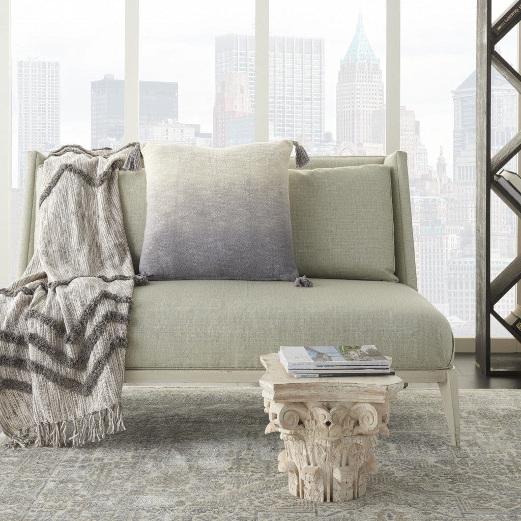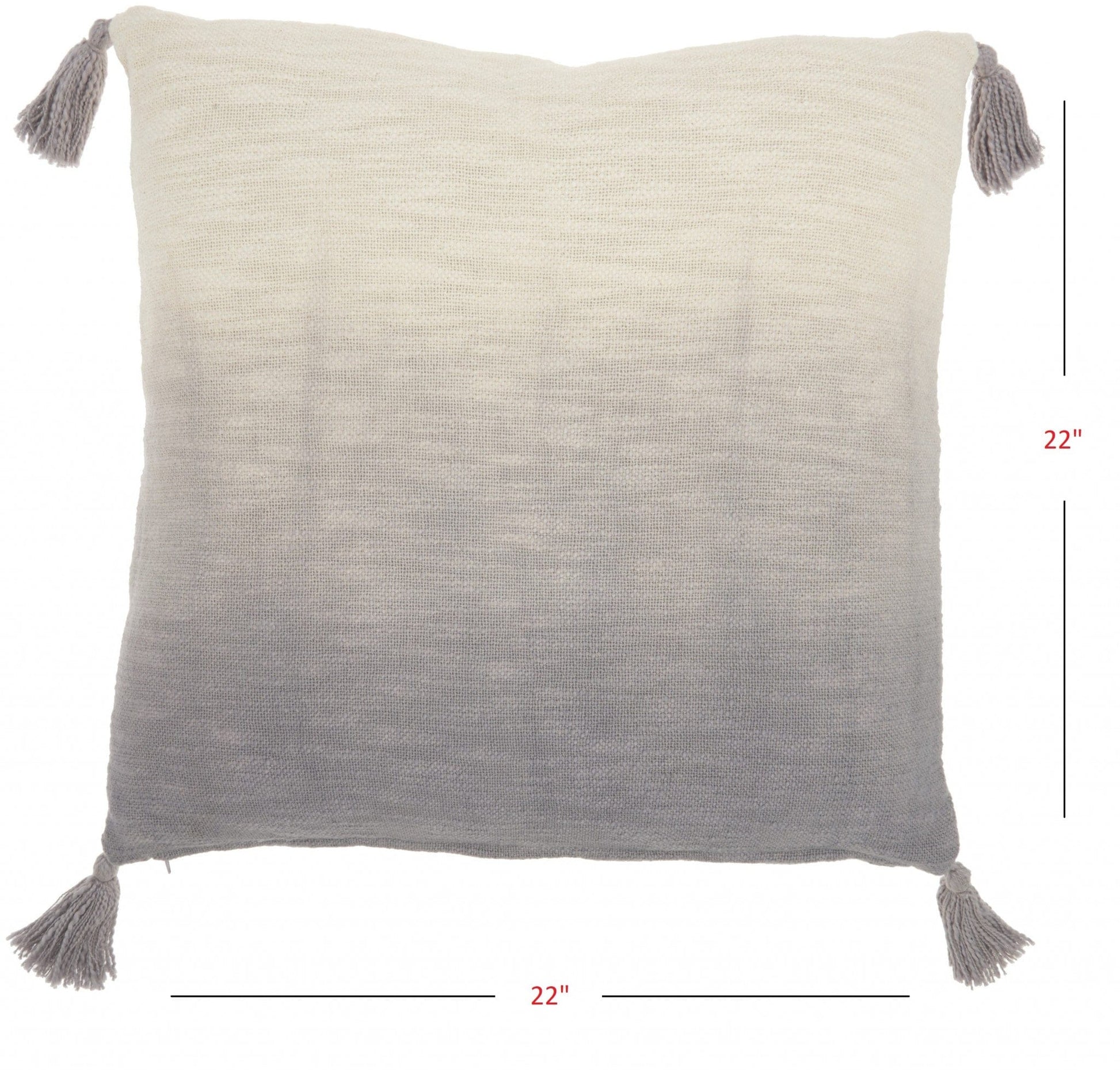This Gray Ombre Tasseled Throw Pillow will help you bring a pop of color to any seating space in your home. This pillow has a square shape with straight edges and fluffy body. The pillow is covered in an ombre patterned fabric with a gray and white colorway. The bottom half starts off as gray and seamlessly transitions into the white colored top. At the four corners there four gray tassels that add a touch of texture to the overall look of this pillow. The minimal design of this pillow allows you to use on your bed, on your couch, or any other chair you have in your home and make it that much more stylish and comfortable. 5" H x 22" W x 22" D