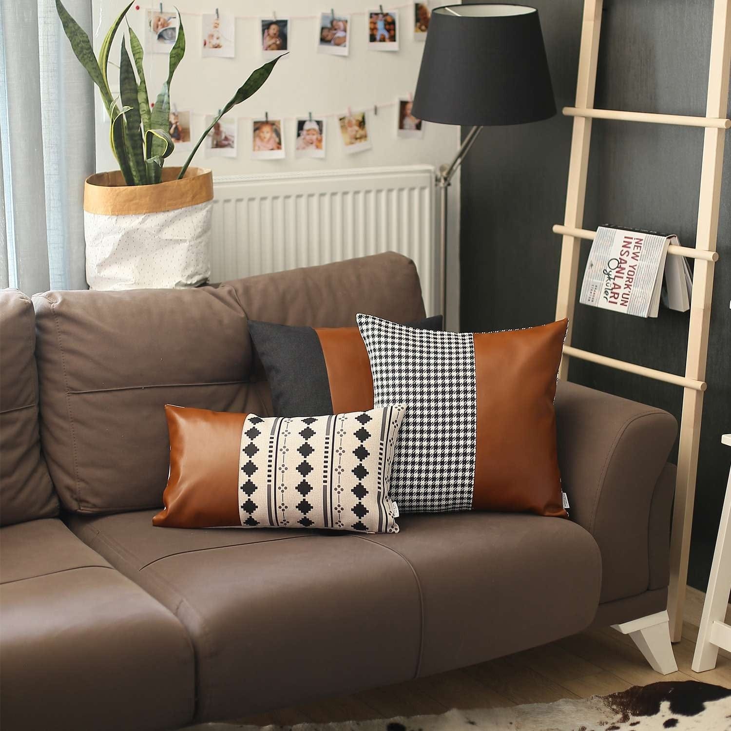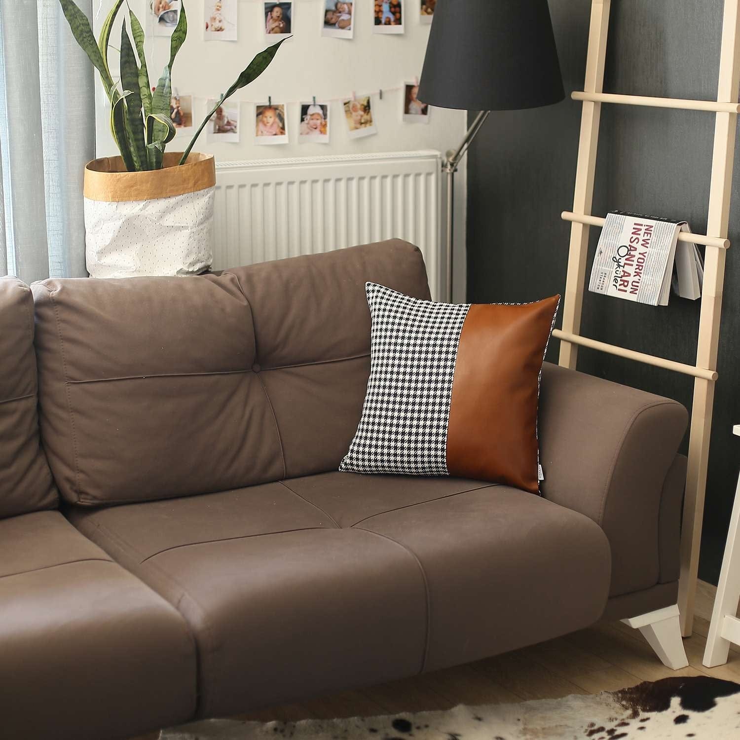 This Houndstooth Divided Brown Faux Leather Throw Pillow kindles a strong first impression with its two-toned design pattern. Bisected with a rustic brown vegan faux leather on one half and a classy houndstooth pattern in jacquard weaving on the other to create a visually striking contrast. Accentuating class and quality with OEKO-TEX Standard 100 certification and comprises of polyester, Pvc, and Pu in the making to ensure durability and product safety while allowing only spot cleaning. The all-around hidden zipper closure gives the pillow a refined finish that feels luxurious on the touch. It comes with a 100% cotton-covered poly filling insert for maximum comfort and a fluffy appearance. Pair this minimally designed throw pillow with any vibrant or neutral interior décor and it will beautifully blend in with its surrounding. 18” x 18” x 1”