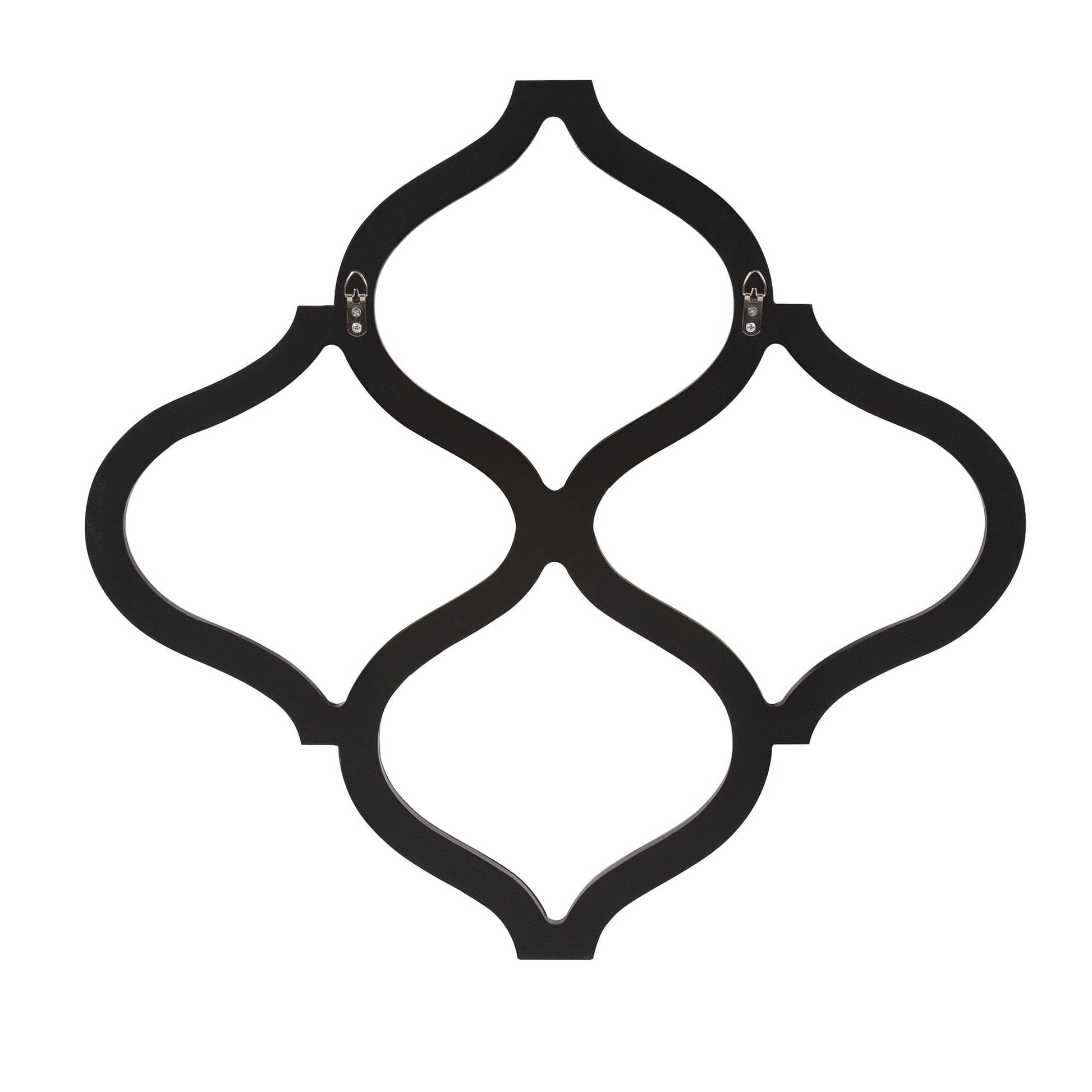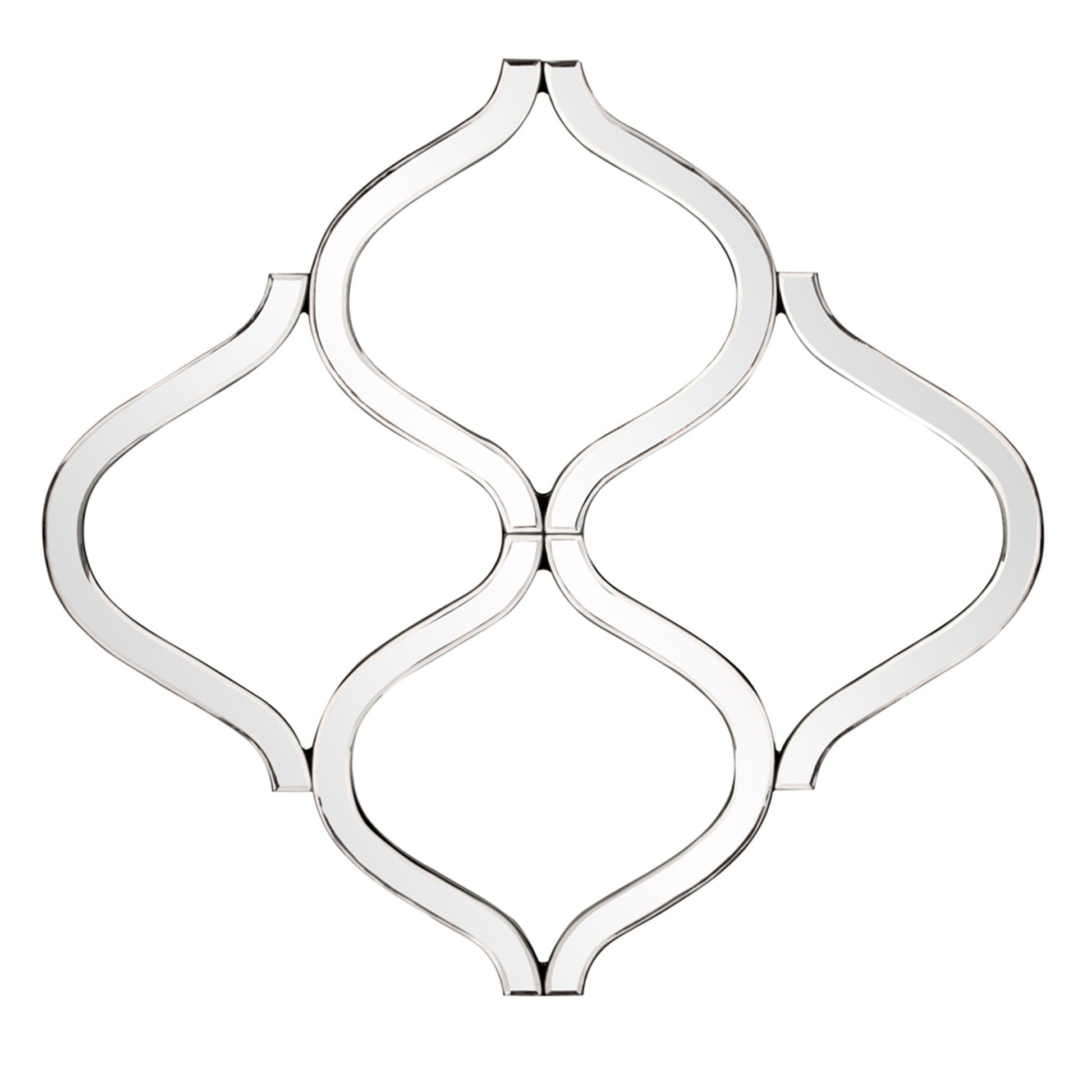 A dazzling piece of curved, geometric shaped mirrored artwork. The piece is made up of a network of interlocking mirrored curvy shapes creating a lovely open work design. On its own or in multiples, ths mirror is a perfect accent piece for an entryway, bathroom, bedroom or any room in your home. D-rings are affixed to the back of the mirror so it is ready to hang right out of the box in a square or diamond orientation! Each mirrored panel on this piece has a small bevel adding to its beauty and style.