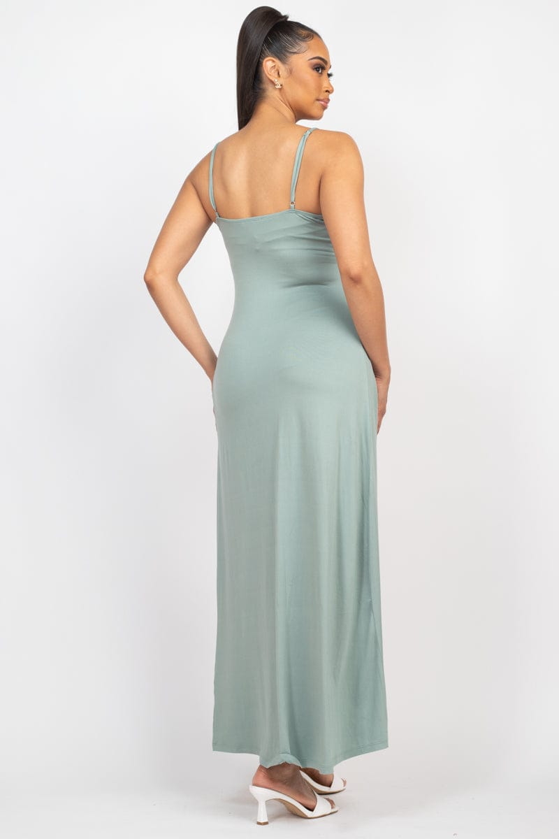Top: A casual top in a solid color featuring a scoop neckline, adjustable cami straps, sleeveless cut, front slit detail, button-down closure, and a full-length.