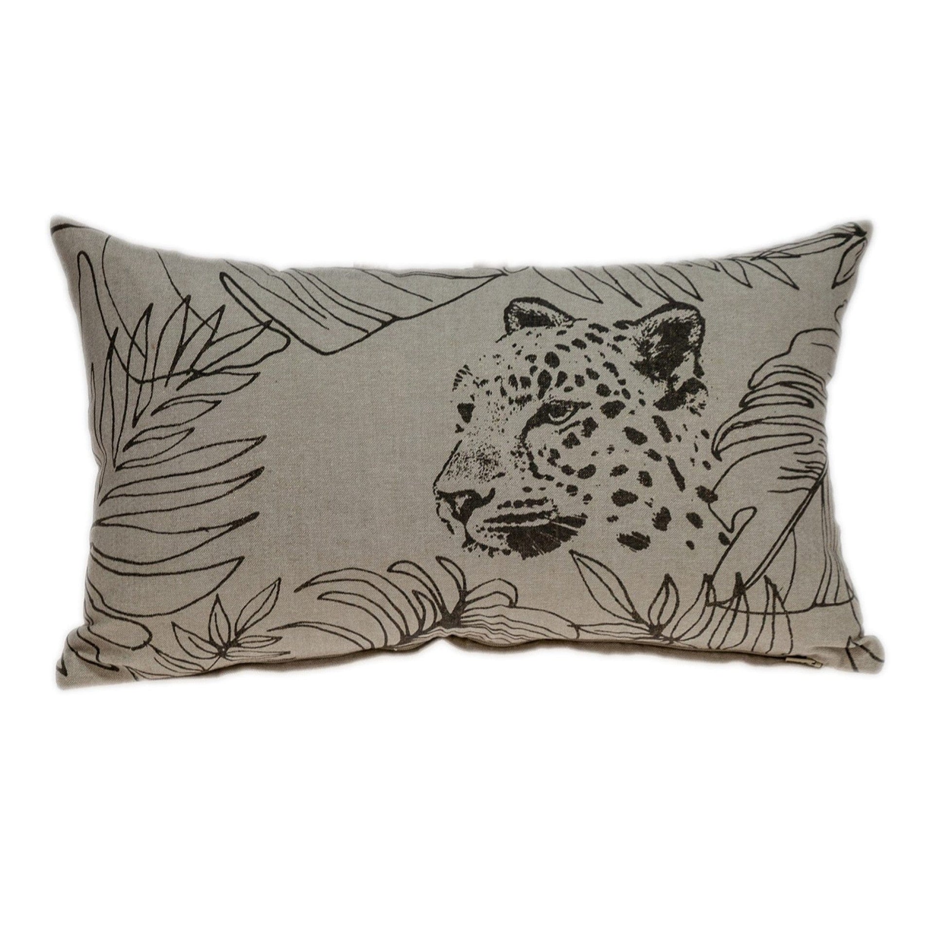 How fun would it be to add a little bit of animal print to your favorite piece of furniture? The Jaguar Silhoutte Lumbar Throw Pillow is just what you need to include some fun and exotic feel to your sofa, chair, or bed. It is the overall neutral tone of the pillow that offers the elegance, while the jaguar print on it makes for the fun element. The print is dark on the oatmeal beige ground with tiny hints of gold to enhance the look of the pillow. 12” x 20” x 4”