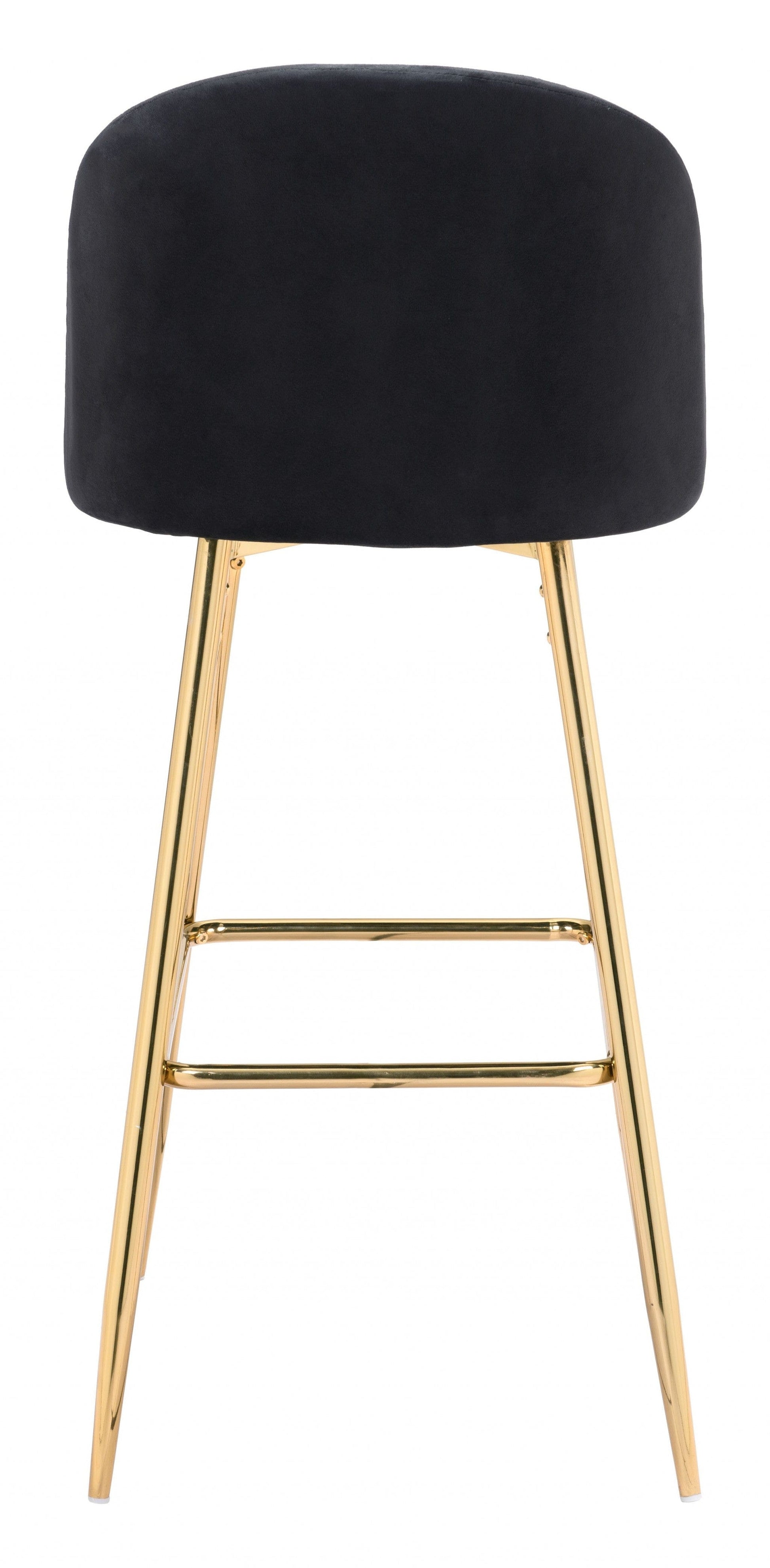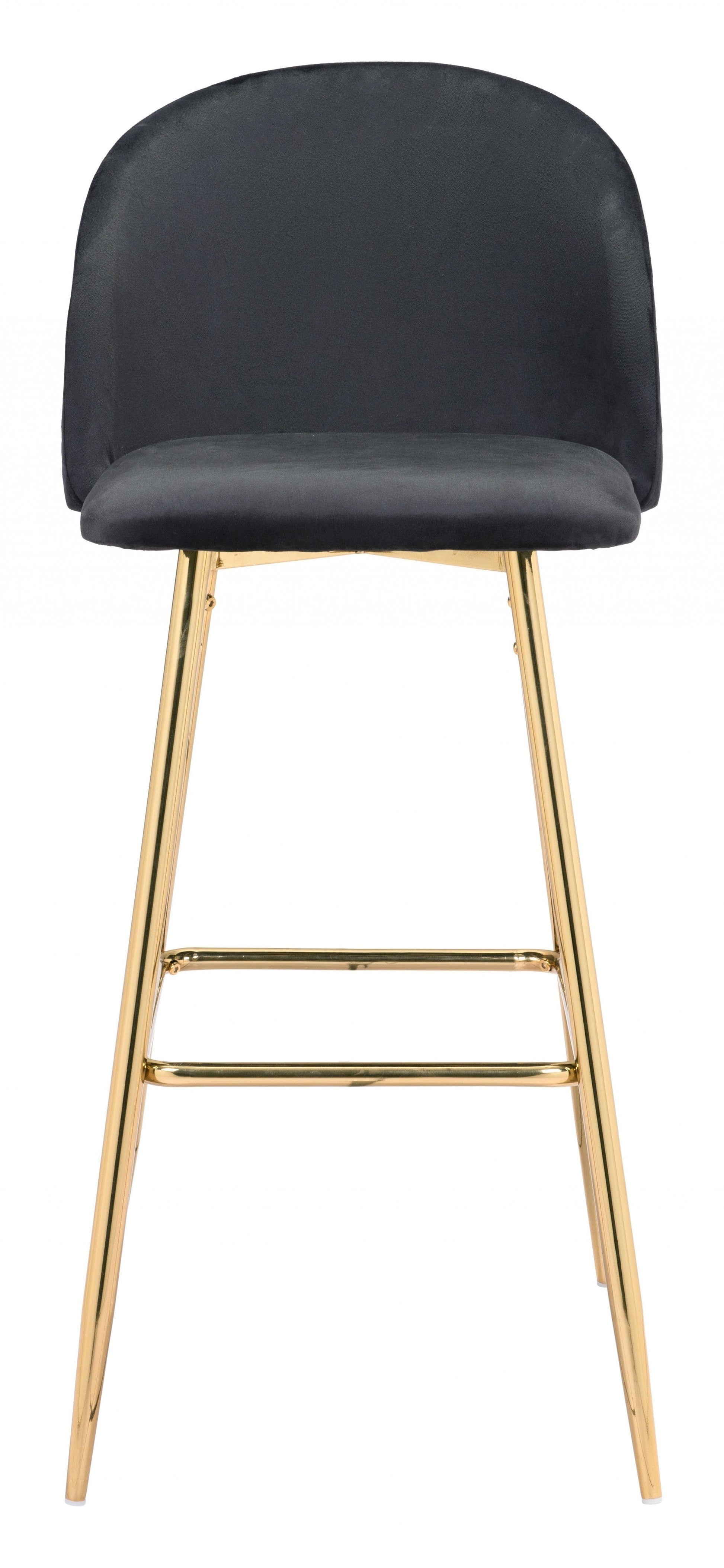 Update your space with a cool vibe from the Jet Black and Gold Modern Pringle Bar Height Chair. This contemporary twist on a classic bar chair will leave you wanting more. The sturdy stainless steel base with a convenient four sided footrest comes in a rich gold tone finish. The seat with partial wrap around backrest in covered in a super and durable soft polyester that creates a striking contrast with the gold. 40.9" x 18.5" x 22.8"