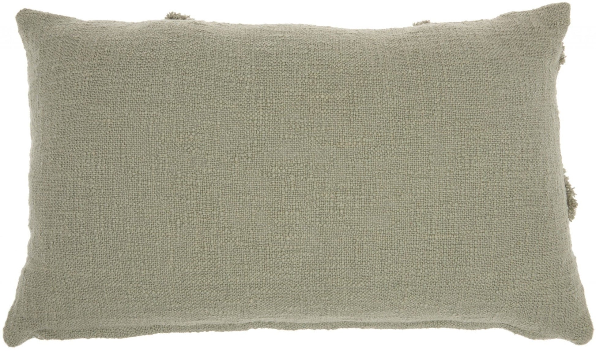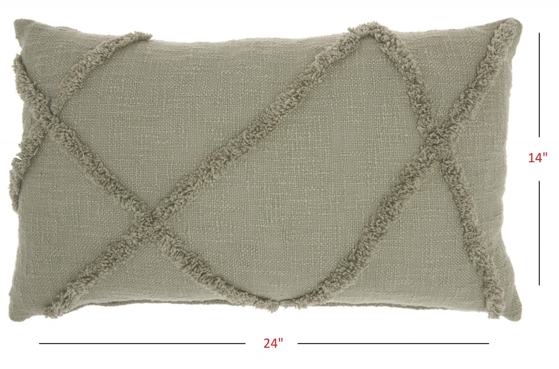 With this Khaki Green Shaggy Detail Lumbar Pillow you can add the perfect mix of design and comfort to your home. This pillow has a rectangular shape and is covered in a textured light grayish green colored fabric. On top of this fabric there are shaggy thread lines in a geometric pattern that are in the same light gray color. The same colored details add a touch of depth and dimension to the overall look of this pillow and will elevate any seating space in your home. You can use this pillow to style up your bed, your couch, or any other seating area in your home and it will work with any existing colors or decor styles you may already have. 5" H x 14" W x 24" D