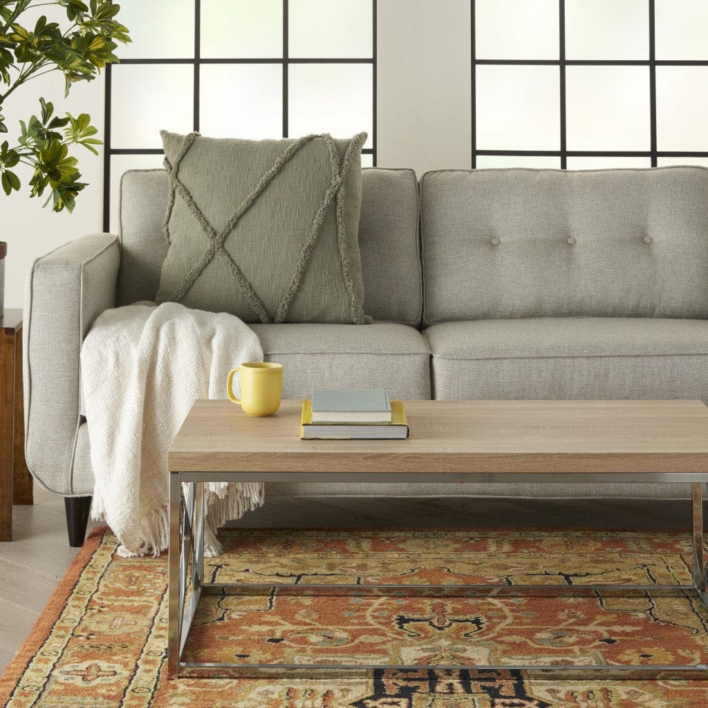 With this Khaki Green Shaggy Detail Throw Pillow you can add the perfect mix of design and comfort to your home. This pillow has a square shape and is covered in a textured light grayish green colored fabric. On top of this fabric there are shaggy thread lines in a geometric pattern that are in the same light gray color. The same colored details add a touch of depth and dimension to the overall look of this pillow and will elevate any seating space in your home. You can use this pillow to style up your bed, your couch, or any other seating area in your home and it will work with any existing colors or decor styles you may already have. 5" H x 24" W x 24" D