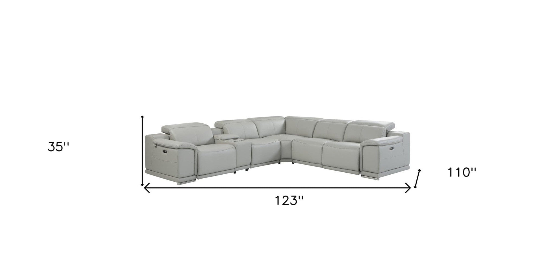 The light gray Italian leather power reclining l shaped six piece corner sectional with console is spacious design meticulously crafted with extraordinary cushion comfort and ultimate durability so everyone in your home can have the best seat in the house. The high-end premium leather used makes your lounging luxuriously comfortable and adds an elegant appeal to your space. Square arms offer a comfy place to rest. For the ultimate in relaxation, this sectional includes power - push button recline that turns it into a comfy lounge for sleeping or resting. Chrome metal legs effortlessly elevate the room and add a touch of contemporary design. This sectional features a short loveseat-style couch that intersects with a long chaise creating a L-shape. Features console storage for convenience and to help keep your space tidy. Great for everyday lounging and for entertaining, sectionals are an ideal way to seat multiple people. 35" H x 123" W x 110" D