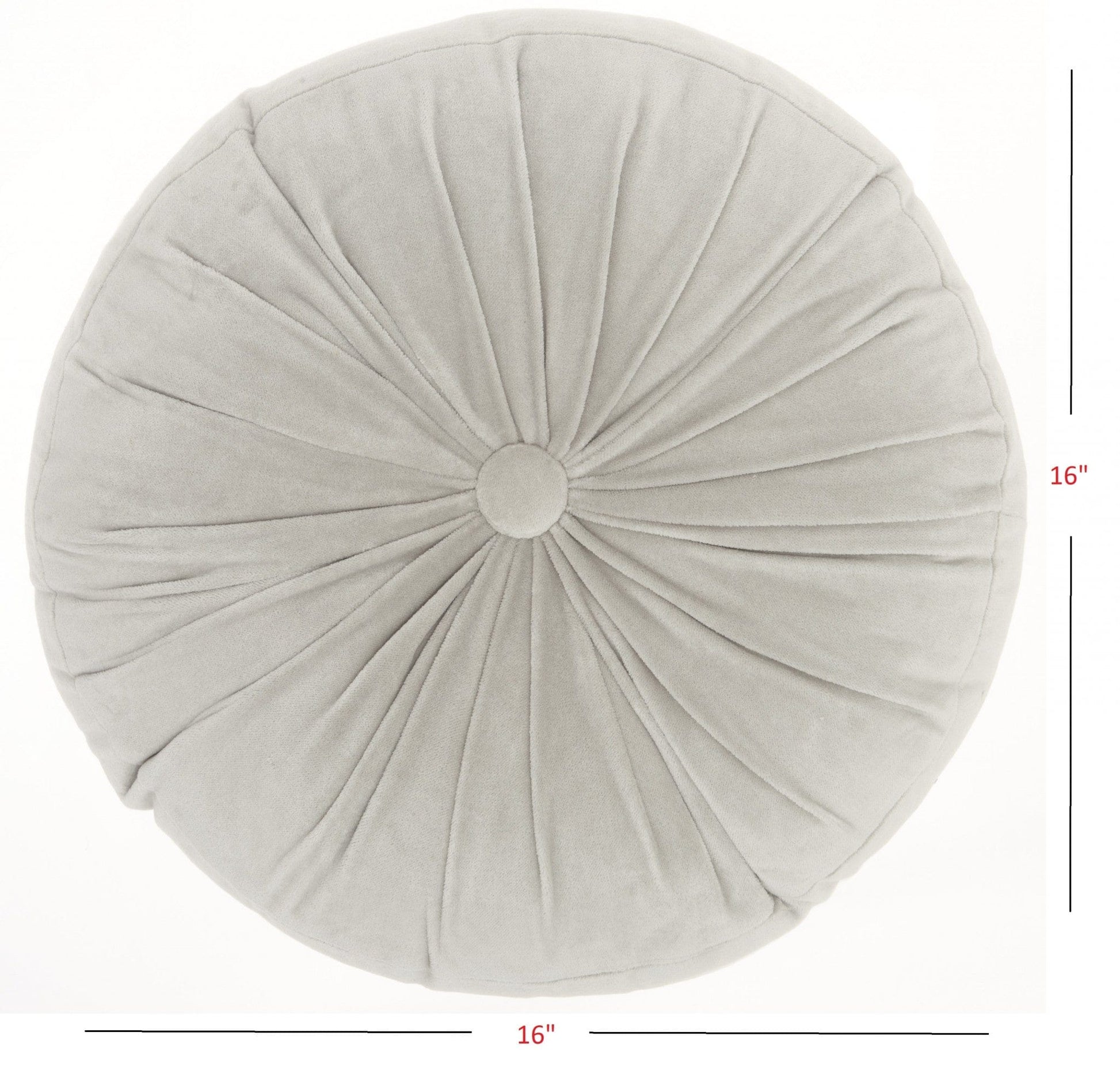 This Light Gray Tufted Round Throw Pillow is the perfect way to add some unique design and comfort to your home. This pillow has a round shape and is covered in a stunning light gray colored fabric. This fabric has a very soft and velvety feel to it which adds to the comfort that this throw pillow provides. This pillow has tufting in the middle which gives it the pleated look and is completed by a light gray colored button holding it all together. This round throw pillow will add a nice depth to any pillow decor you have on your bed, on your couch or can be used as a stand alone pillow on your favorite chair as well. 5" H x 16" W x 16" D