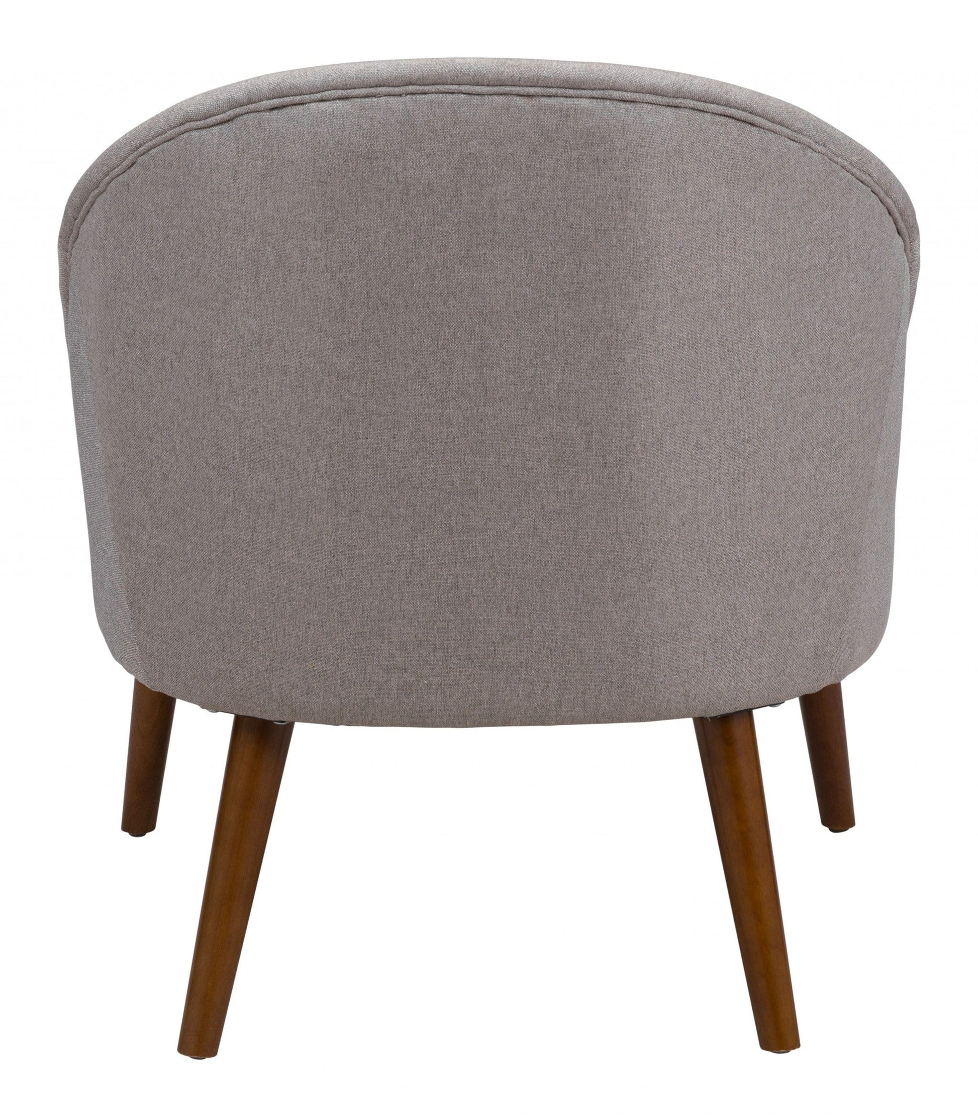 The perfect way to relax after a long day this Light Gray Wooden Deep Chair will elevate the look of any space in your home. The base of the chair is made solid wood and features a simple four legged design. The dark brown varnish on the legs emphasizes the tapered shape of each leg. The seat has a deep curved shape to it with the back flowing into the tapered armrests. The back has button detailing on it. The whole seat and back are covered in a light gray fabric. The seat cushion is also covered in the same light gray fabric with pronounced seams. Use this chair in your living room your bedroom or in your home office. 33.1" H x 28" W x 26.4" D