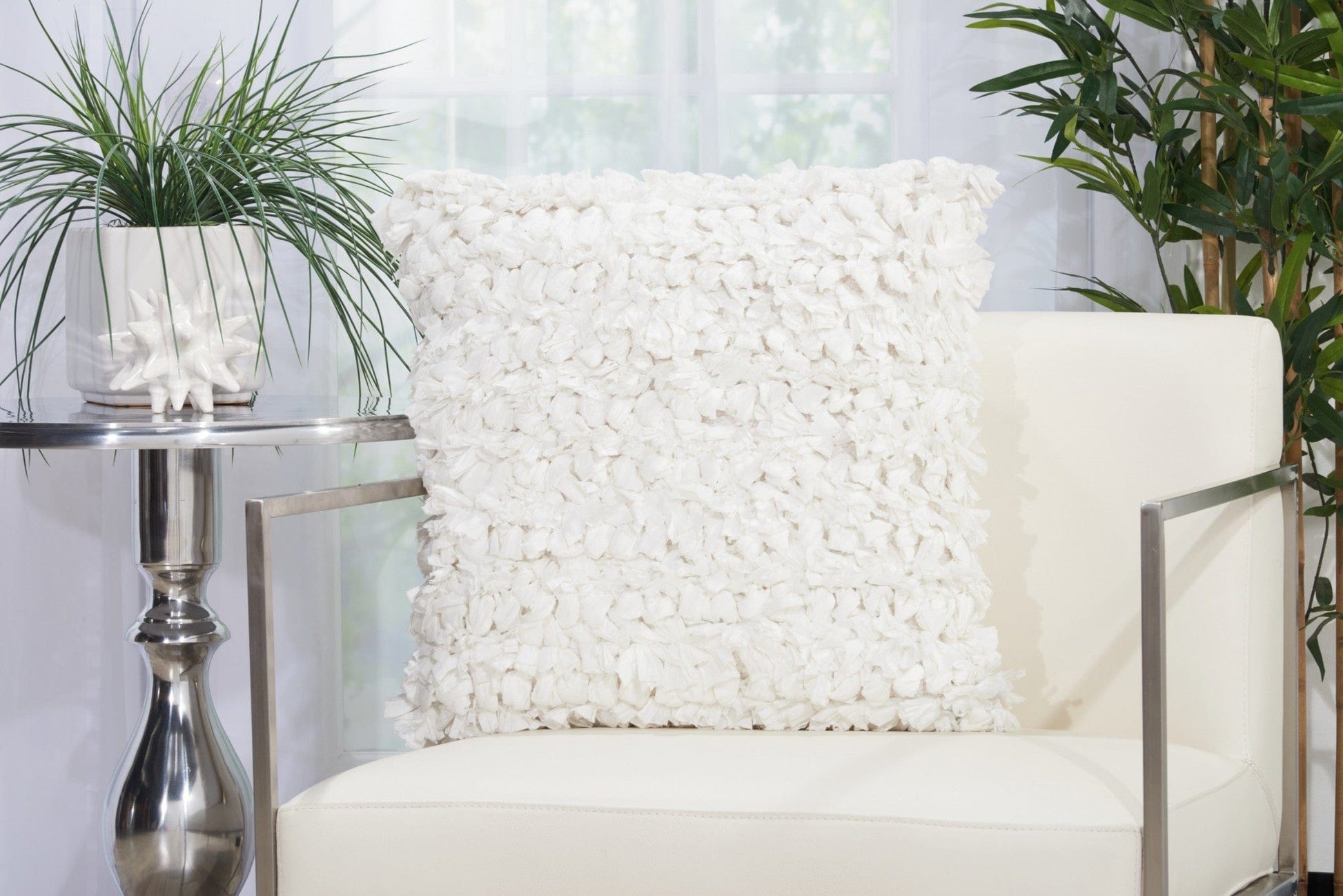 Add more comfort to your interior style with this Loose Luscious Shag White Throw Pillow which is made to make you feel like you're sitting against a cloud. The throw pillow is covered in a shaggy fabric that has a more chunky weave to it and is in a bright white color. This throw pillow will look great in any room of your home, whether that is in the bedroom, the living room, or even as an accent piece on your favorite chair. 6" H x 20" W x 20" D