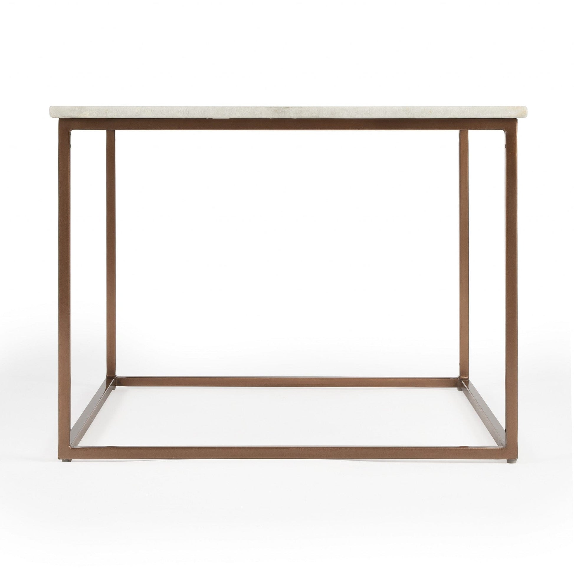 Clean-cut and crisp, the Marble and Metal Coffee table is a quintessential model of sophistication. A white marble top is fastened on four bronze finish iron legs that transforms its simpleness to class. Place this table in any corner of your home for the perfect ad complete look. You can serve your drinks or your coffee over it. 18" x 24" x 24"
