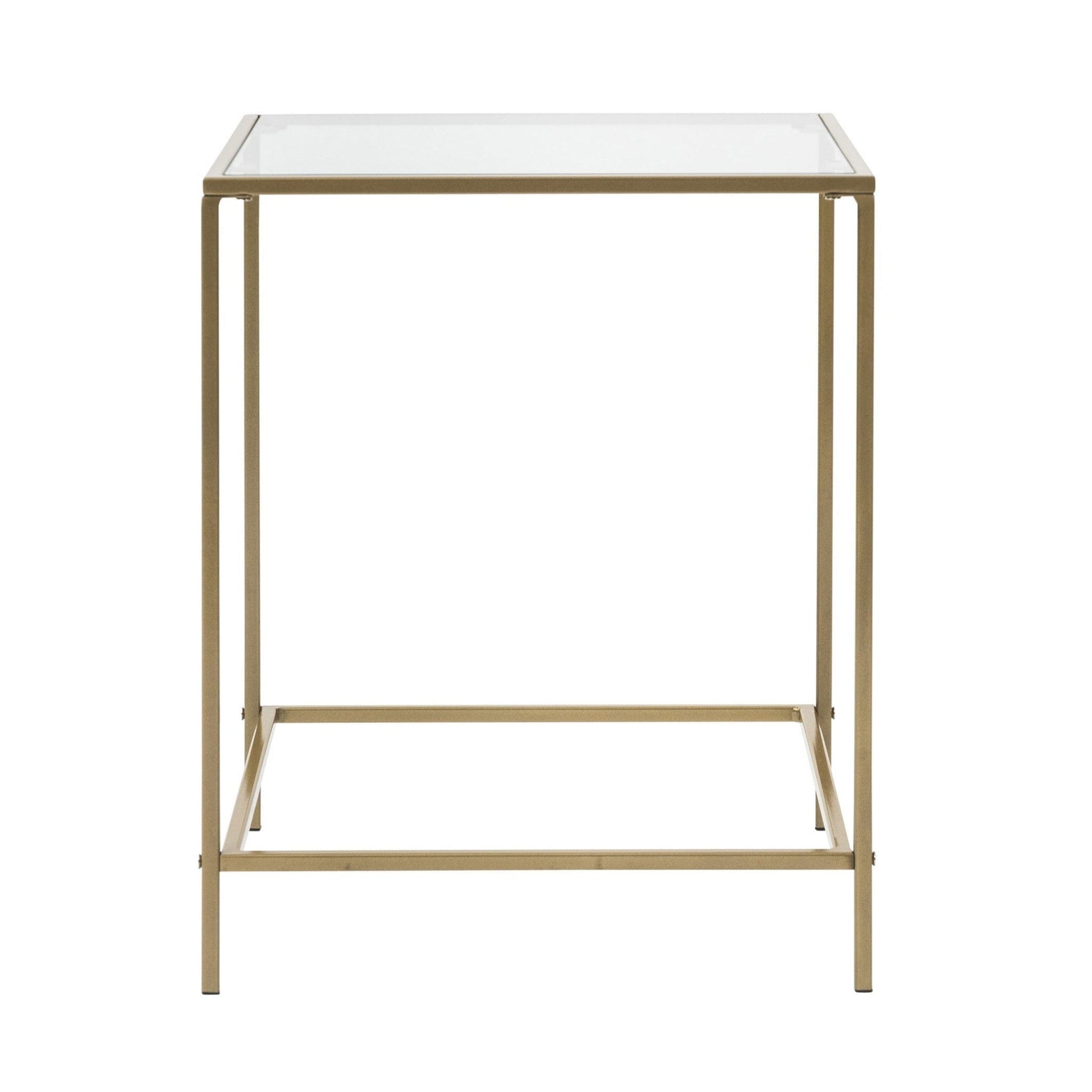 A modern way to add utility and style to any space, this Minimalist Clear Glass and Gold Side or End Table will elevate the look of your home in an instant. The metal frame has a dull gold finish on it and a very airy and open stature. There are two square pieces on either side of the frame that act as legs. The two pieces are connected by another square base piece and a square tabletop holder. The tabletop is made of tempered glass and is left clear to fit in with the minimalist aesthetic. Use this table in your bedroom, your living room, or even in your entryway to hold your keys and wallet. 22" H x 18" W x 18" D