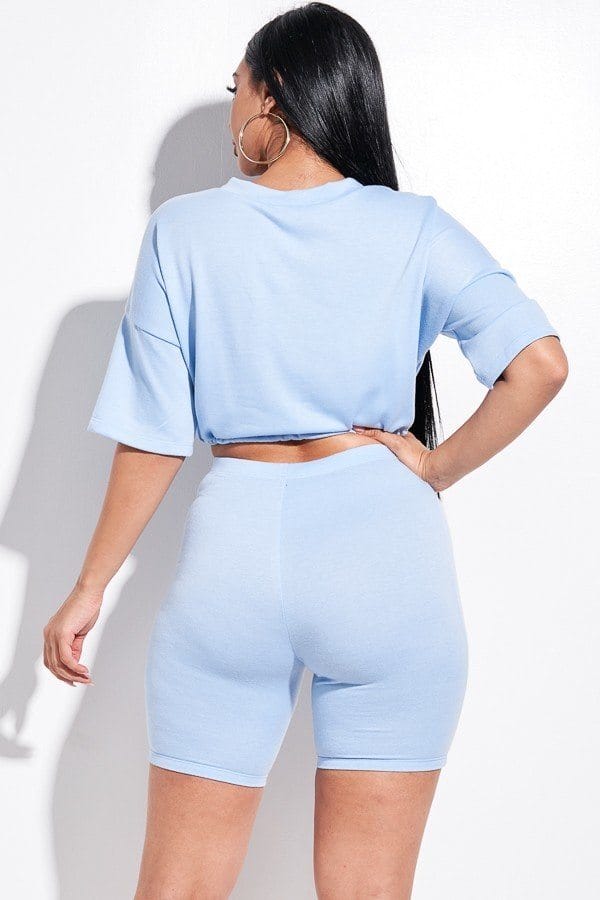 solid french terry short sleeve tie front top and biker shorts 2 piece set