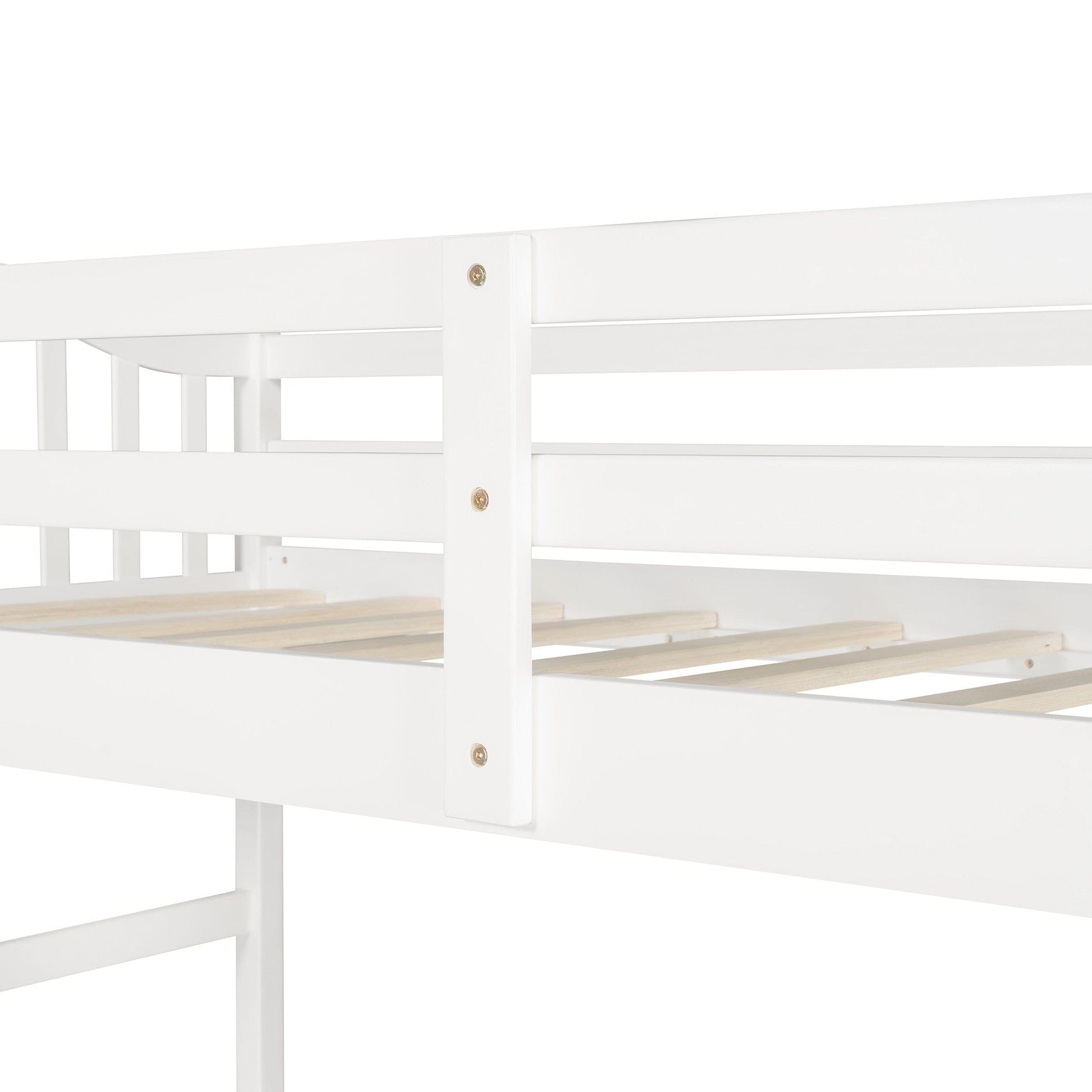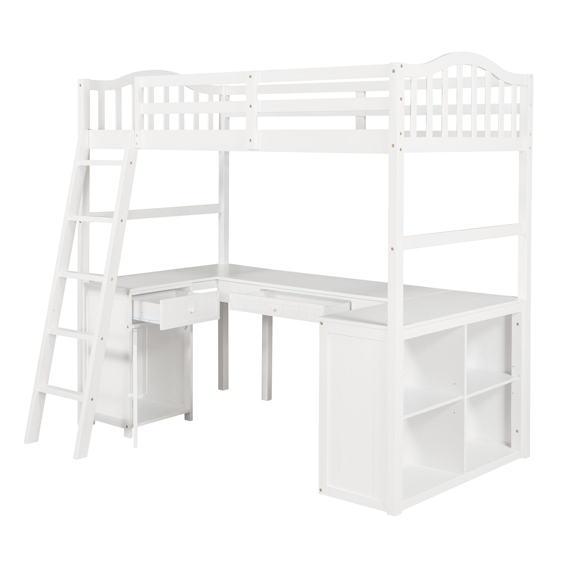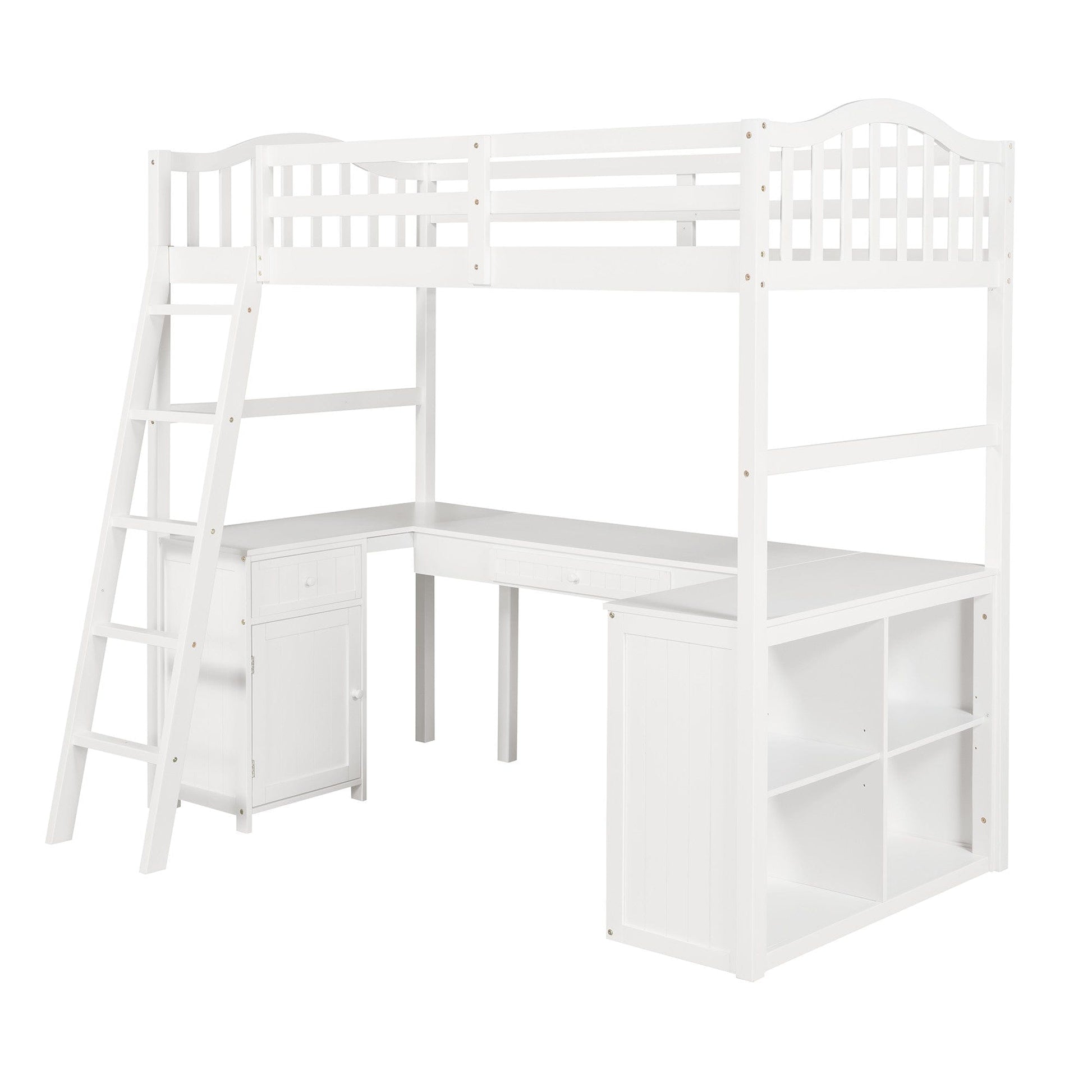 Utilize every inch of the available space with the good looking and practical, Modern Classic White Twin Loft Bed with Book Shelf, Desk, and Cabinet. This awesome set features a loft bed with a ladder, a full-length safety railing, a full length desk with wrap around tabletop space, a storage cabinet and drawer, and a four cubby bookshelf. This incredible work station underneath gives you loads of storage. The frame of this bed/workstation is made from high-quality wood and MDF. It is sturdy, durable, and was designed for maxium use of space in a cool and updated design. Additionally, the bed frame has 10 wooden slats that not only provide comfort but support and ventilation to improve the life of your mattress. No box spring is needed. This fun and fashionable bed and workstation combo features and updated design with classic lines and a crisp white finish. 72" x 78" x 42"