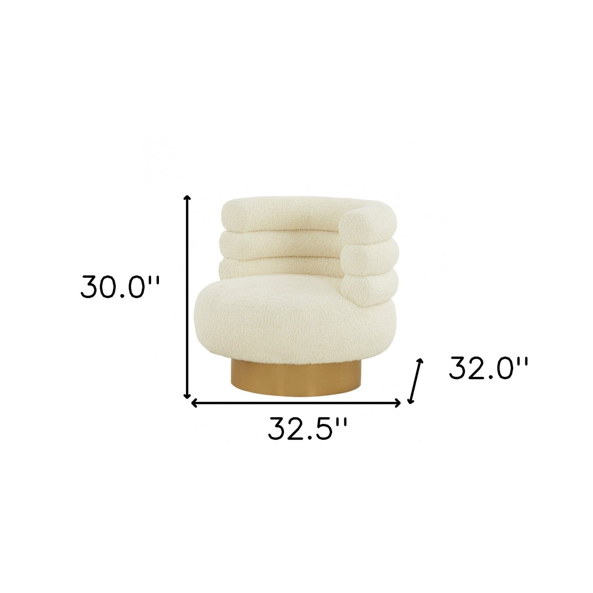 Upholstered in the softest cream sheep fabric, this Modern Cream Fabric And Gold Accent Chair is the perfect addition to your living room space. This chair has soft muted colors and a simple design that makes it an effortless statement piece for your home. It features a barrel tufting on the back rest, a round, soft cushion, and a gold metal base at the bottom of the piece. 30” x 32.5” x 32”