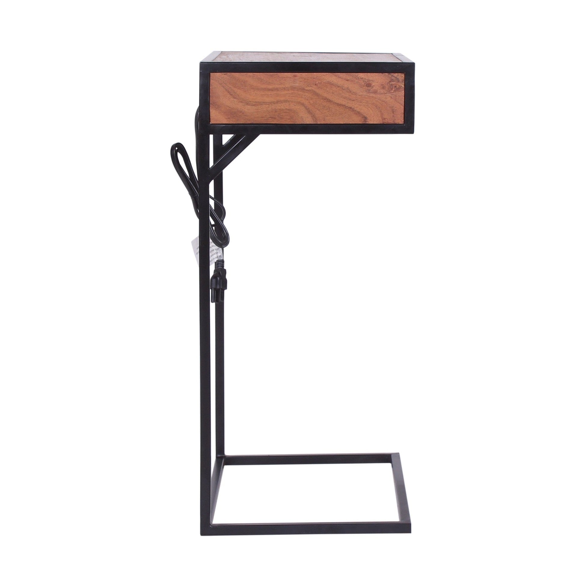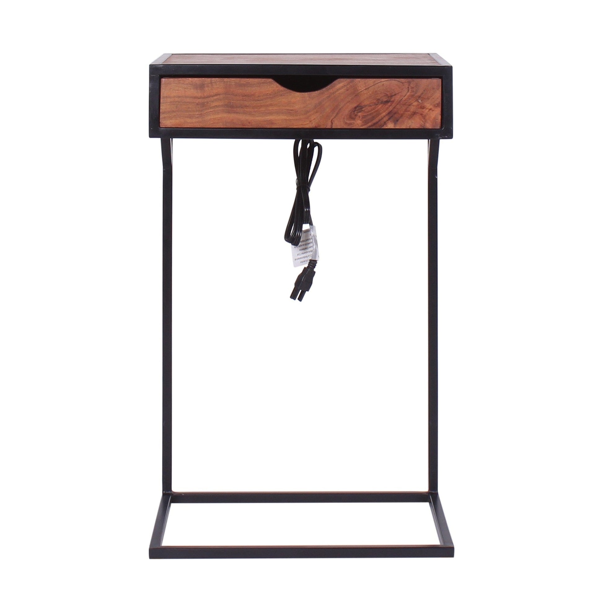 Add convenience and storage to your office, bedroom, or living room with this Modern Dark Wood End or Side Table with USB and Storage Drawer. This end table comes with a built in USB port and electric outlets discreetly tucked underneath to keep your devices charged and running and not be unsightly. Modern and simple in its profile, this C-shape table has a spacious top for drink, snacks, remotes and even most laptops. There is a convenient pull out wooden drawer for storage. A new twist on the TV Table, this modern rustic finish metal and wood side table is the perfect addition to any space. 25" x 11" x 16".