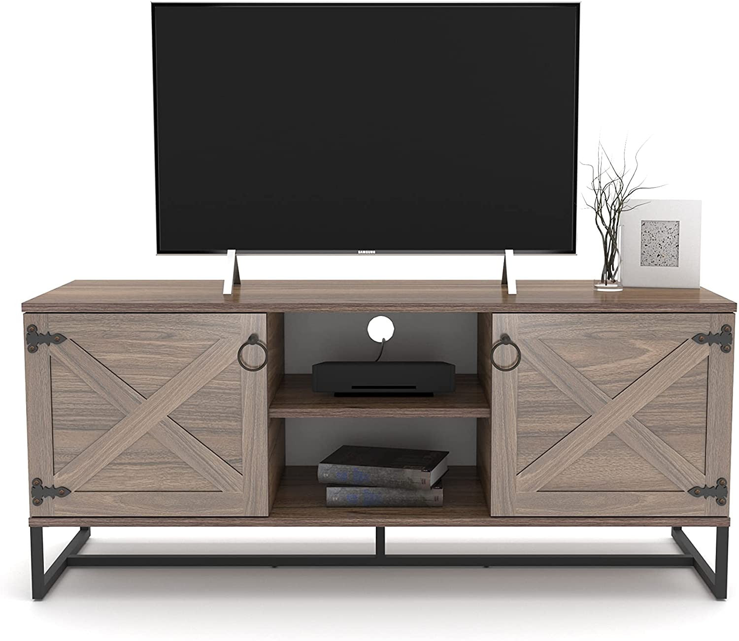 Update your space with this Modern Farm Style Wood Grain and Black TV Media Stand. Built to last, this sturdy and unique home entertainment center is designed to hold your flat screen TV, hide your clutter, and store your media and technology. Equipped to hold up to a 55" screen this unit includes two cabinets with doors and an open cubbie unit with a shelf to provide lots of storage and organization. Vintage farmhouse styling including black hardware detailing and circular ring door pulls, give this cabinet some charm. The wood grain of the sturdy laminate finish marries nicely with the black. 23.6" x 55.1" x 17.6"