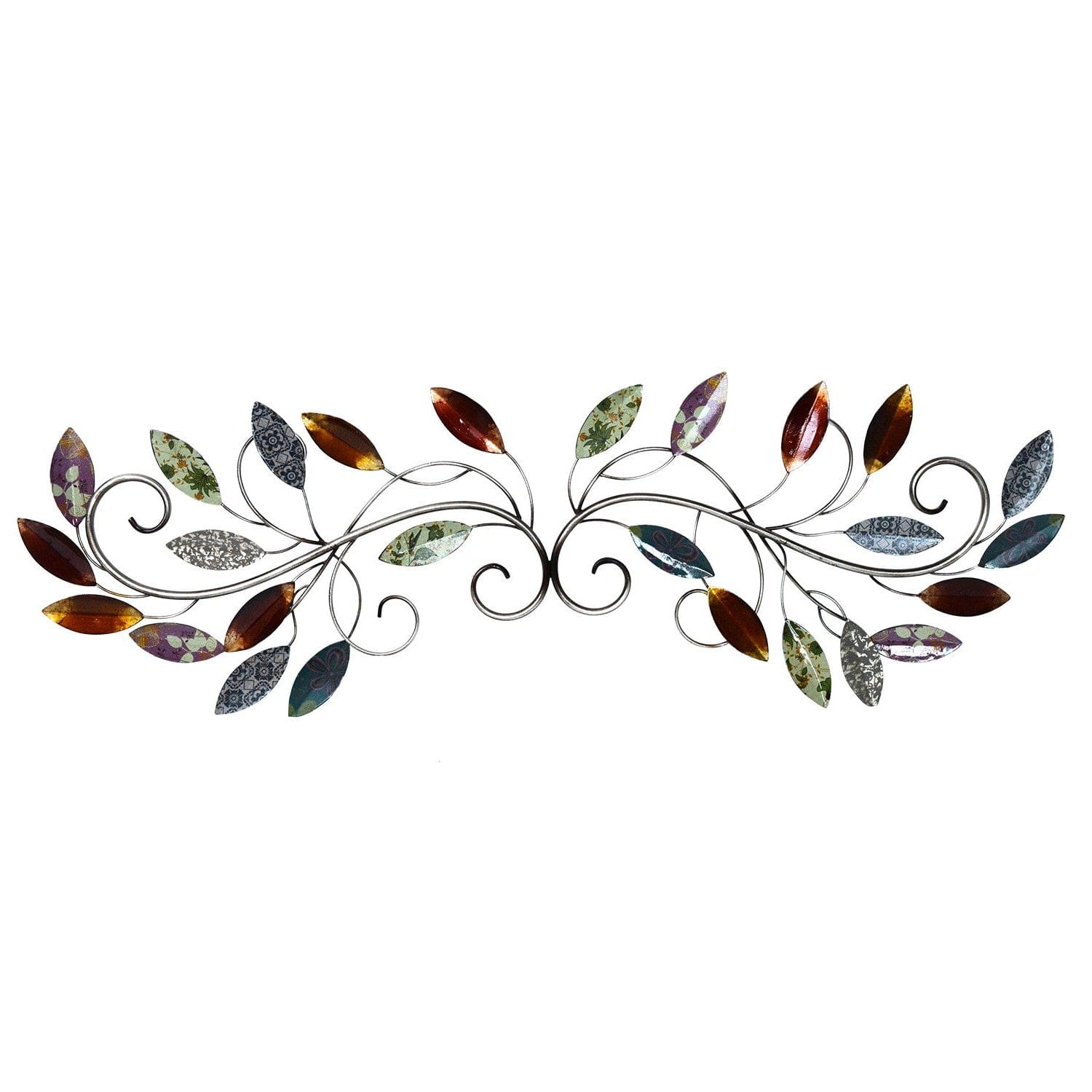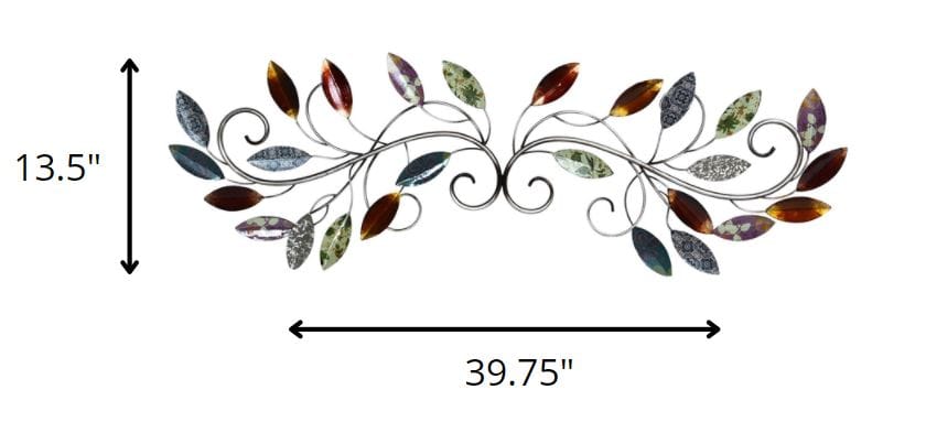 This multi leaf scroll wall decor will look extremely cool on your wall. Handcrafted from metal, the scroll wall art is designed to add warmth and classic style to your existing room decor, whether in the living room, bedroom or study. Featuring hand-painted multiple color and pattern leaves that is complemented by a charming metal scroll, this piece will readily blend with any home decor. Traditional style 100% metal Attached keyhole hanging method Vertical hanging orientation Wipe clean with damp cloth. It measures 39.75" X 0.75" X 13.5".