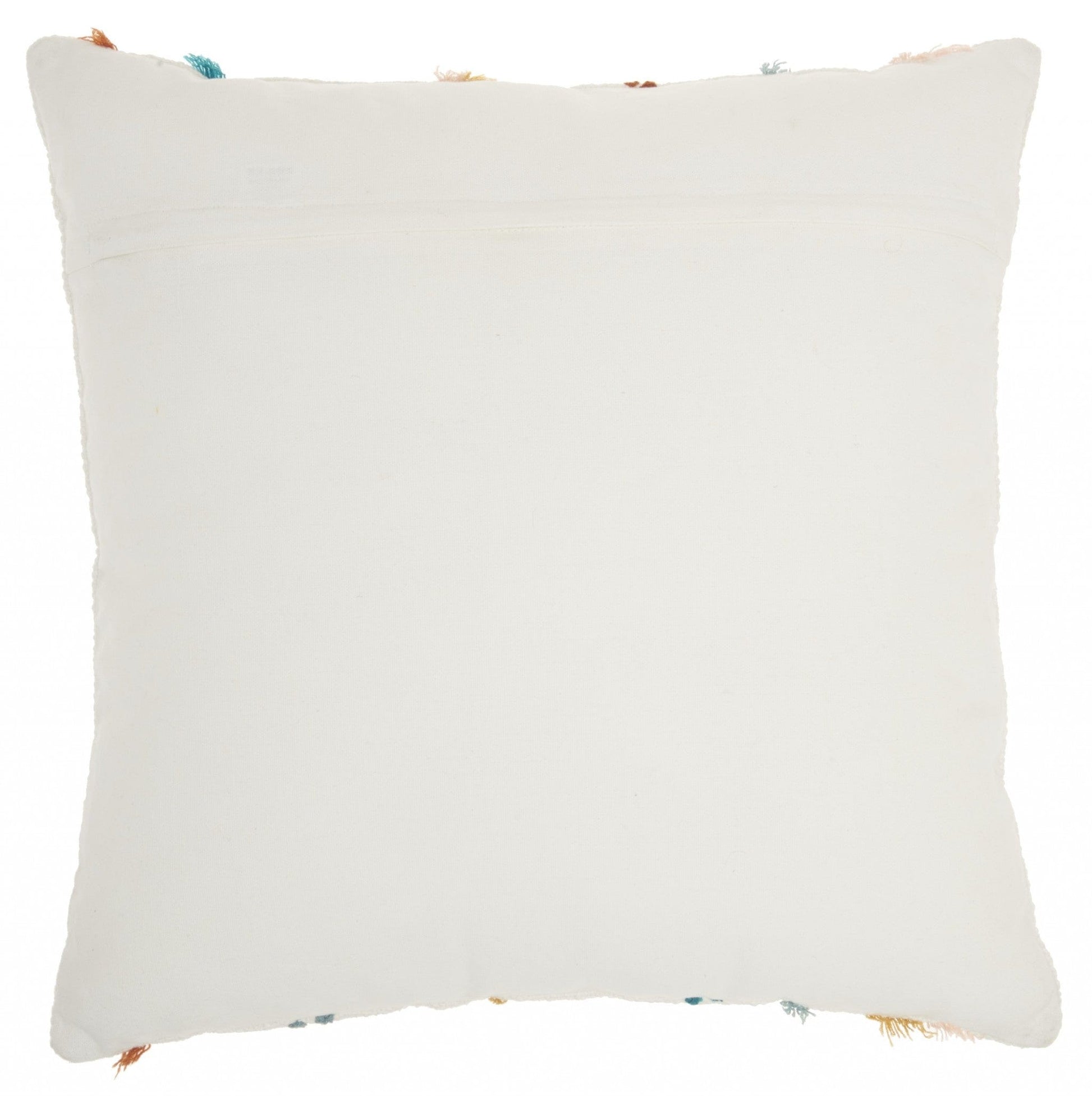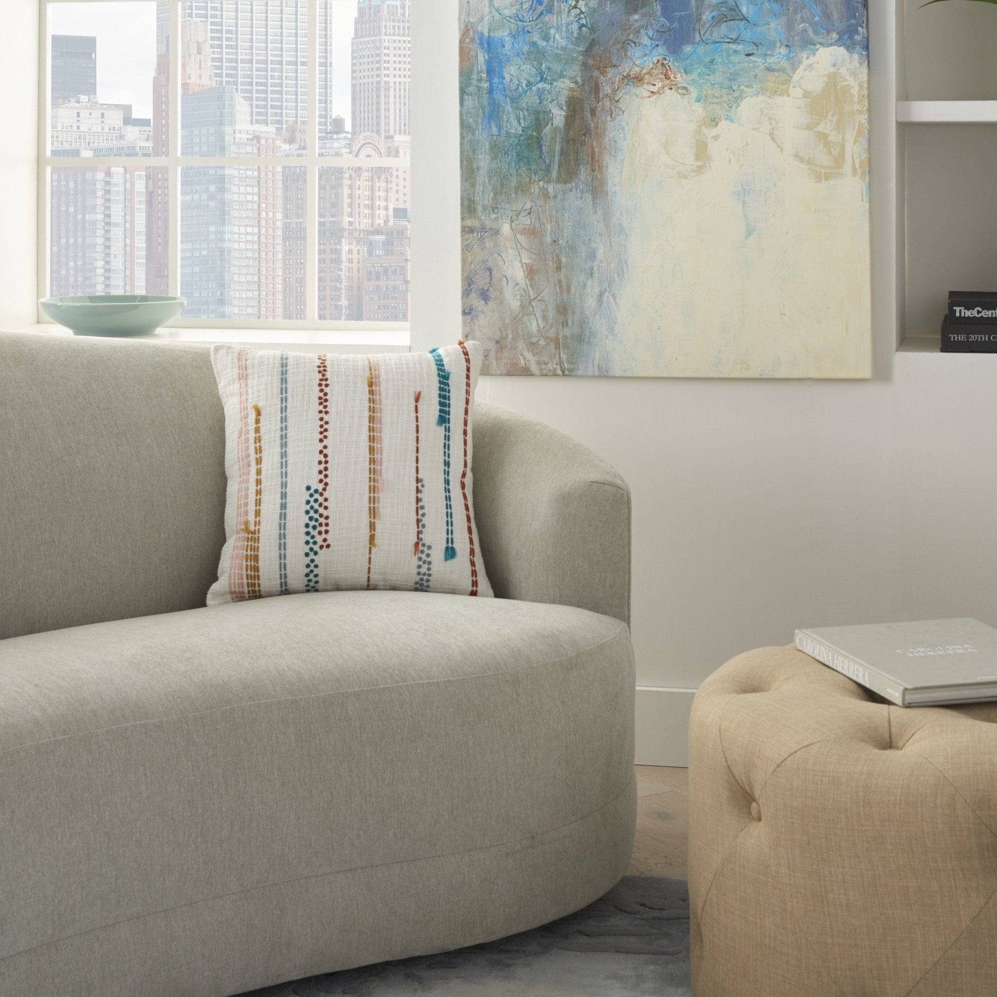 This Multicolor Embroidered Stripe Throw Pillow is the perfect way to add a pop of color to any seating space in your home. The square shaped pillow is covered in a white colored textured fabric which serves as the background for the colored stripes. Some stripes have a stitched dash design while some have a stitched dotted design. There are some stripes that have been left untied which adds a touch of depth and dimension to the overall look of this pillow. You can use this throw pillow to elevate your bed, your couch, or even your favorite chair. 5" H x 18" W x 18" D