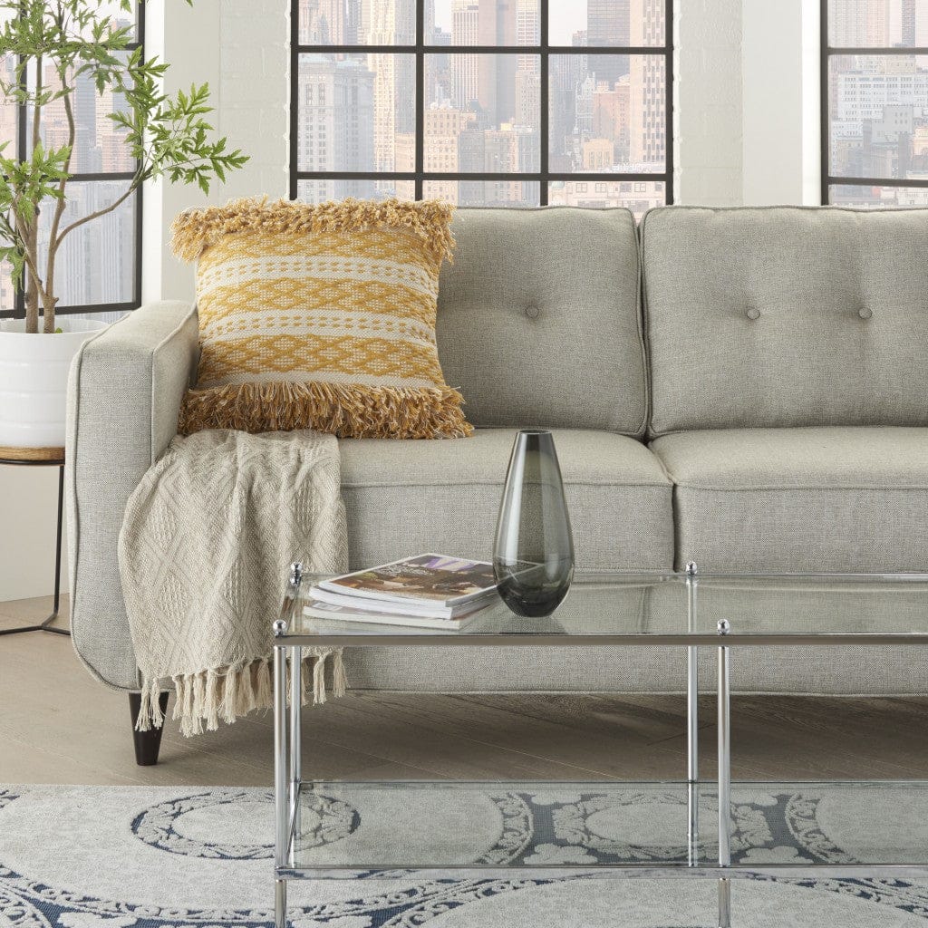 Boast a unique Mustard and Ivory Textured Throw Pillow in your bohemian set up to express your creative side while being warm and welcoming. The fluffy and soft fringes on the top and bottom make for an amiable look. The soft hints of ivory and rustic mix of mustard used throughout the piece, including the fringes, create a warm and homey atmosphere. This piece is made with the use of high-quality 100% cotton to ensure longevity and ease of use. Shades of bold hues will work wonders in contrasting the unique mustard yellow used throughout the body and makes for an exquisite abstract bohemian look. 5” x 20” x 20”