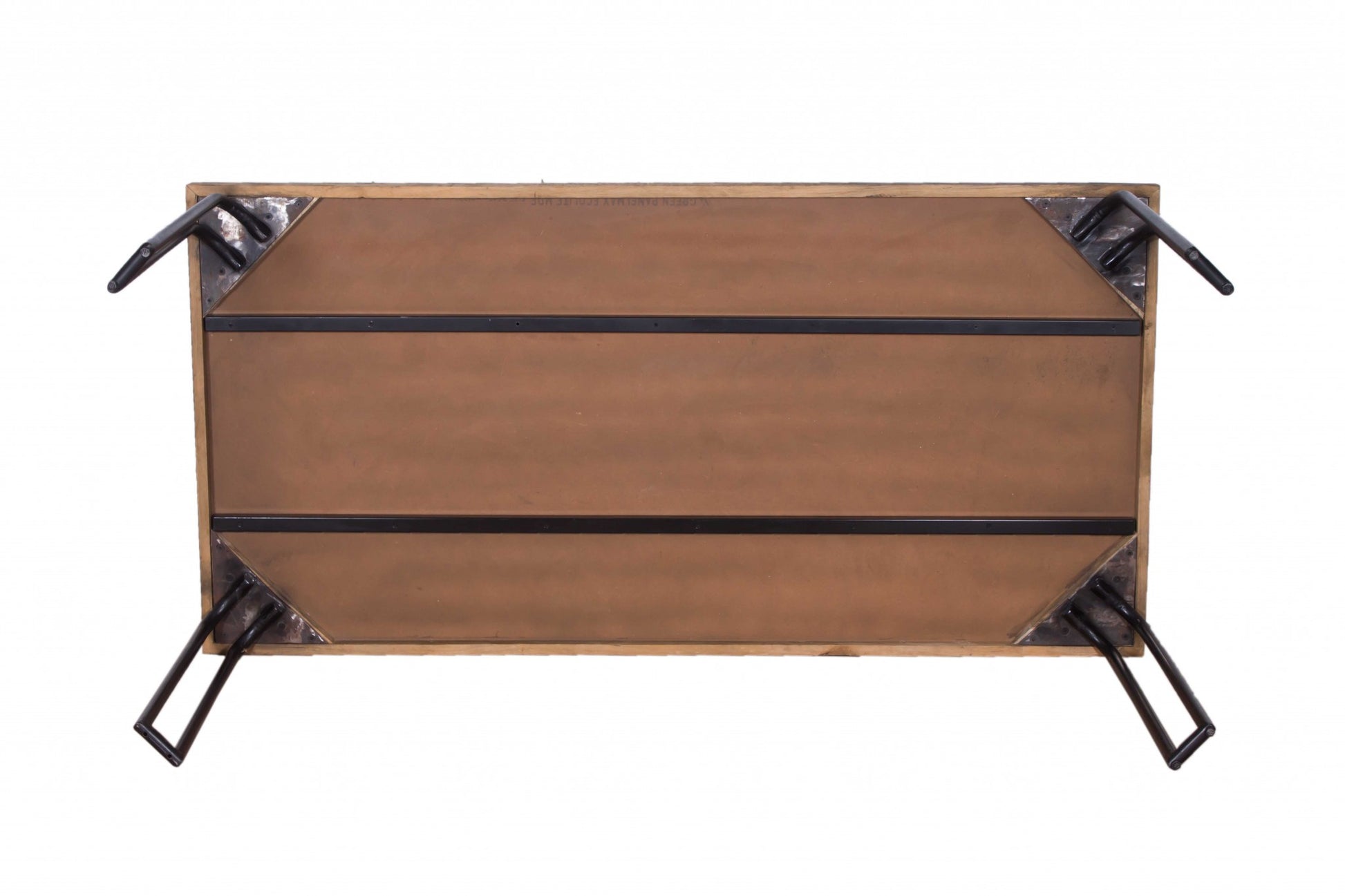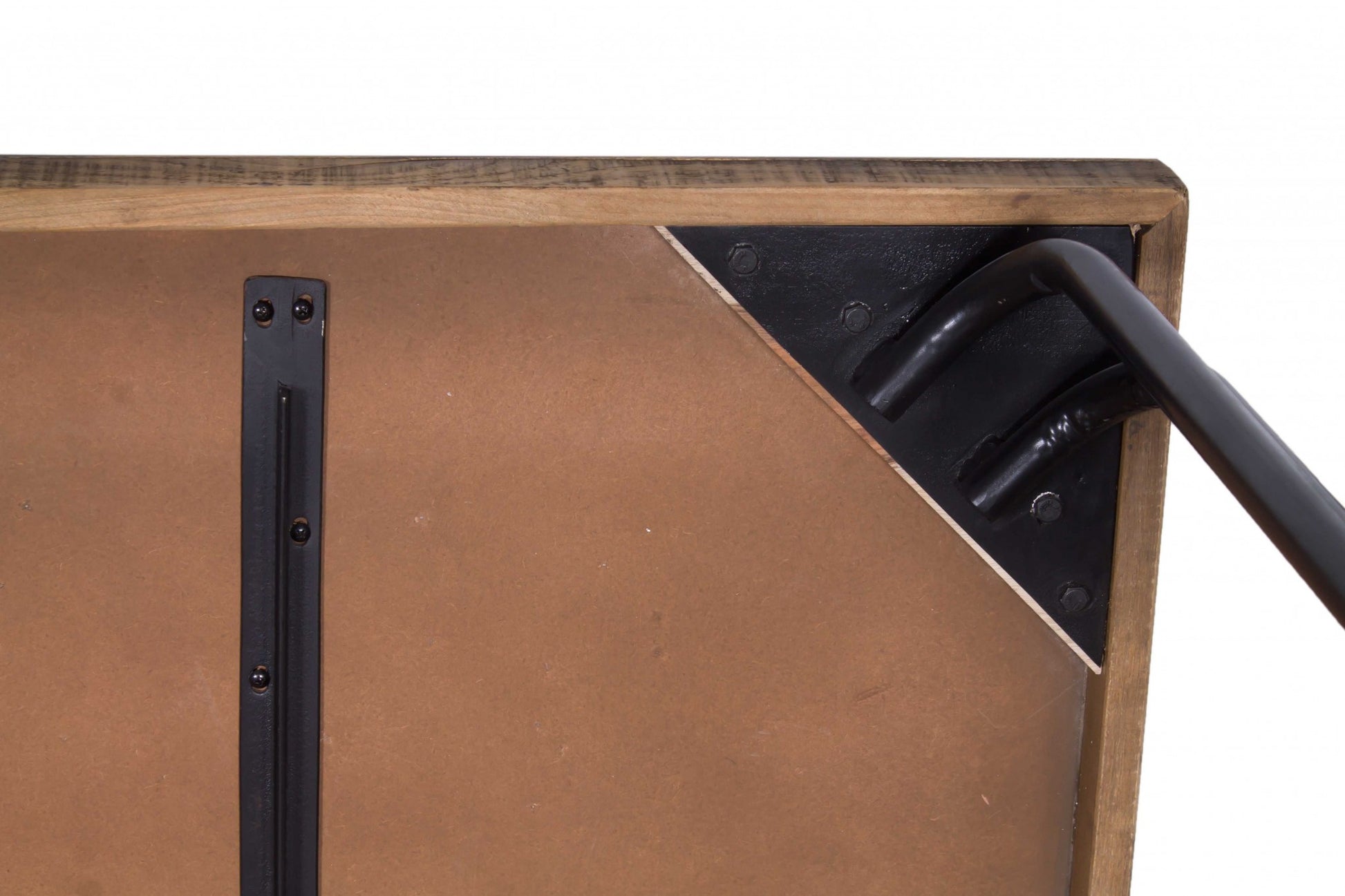Standing on a delectable metal frame legs, this table catches the eye from every corner of the dining room. It is designed with a rectangular wooden top that is large enough to sit family and friends at a meal. Various visual and textural elements are featured on this table to give it the perfect rustic feel for your home. These include knots, color variations, deliberate but charming imperfections and lots more. Its natural finish is simply the best for it. Dimensions: 40" X 80" X 30".