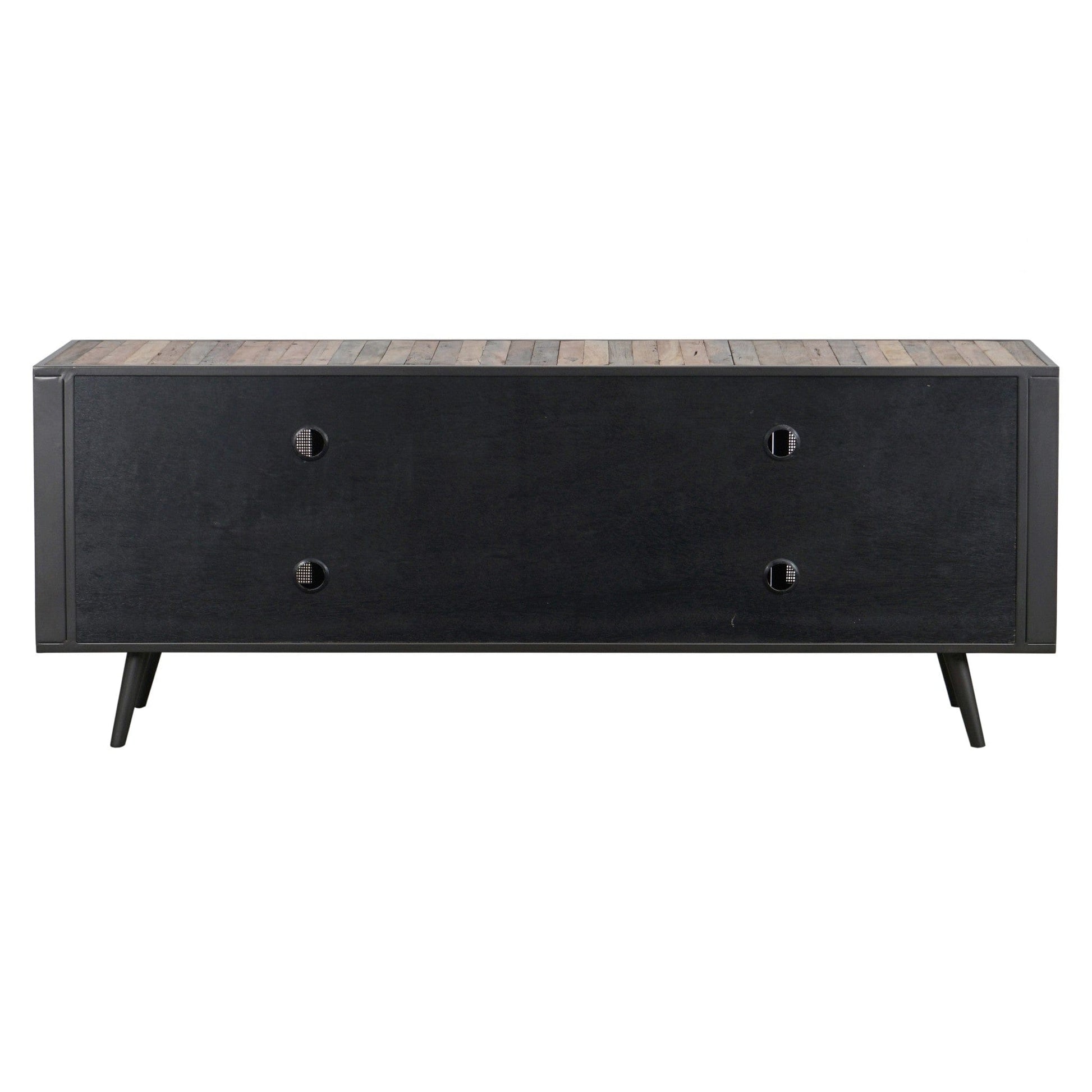 An amalgamation of vintage charm and excellent function the Rustic Black, Natural Wood and Rattan Media Cabinet with Four Doors is a design of perfection. With a classic fusion of hardwoods and plywood with an iron framework and Rattan weave doors this cabinet makes a strong impact in any living room. The wide levelled table with four doors and fixed wide shelves provide ample room for all your entertainment components. A cord cut-out can be found behind one of the cupboards for easy cord managment. A modern and gorgeous mix of black wash stain and colorful natural tone wood slats allows a true appreciation for the natural beauty of the genuine wood. Handwoven rattan with vertical iron pull handles add a unique and natural esthetic to the doors making it the perfect and unique addition in any room. The entire unit sits on four strong flared legs for added support and durability. Aside from obvious use as a TV and Media Center this great piece can also be used as a buffet server or storage cabinet in any room or hallway. 30.31" x 78.74" x 17.72"