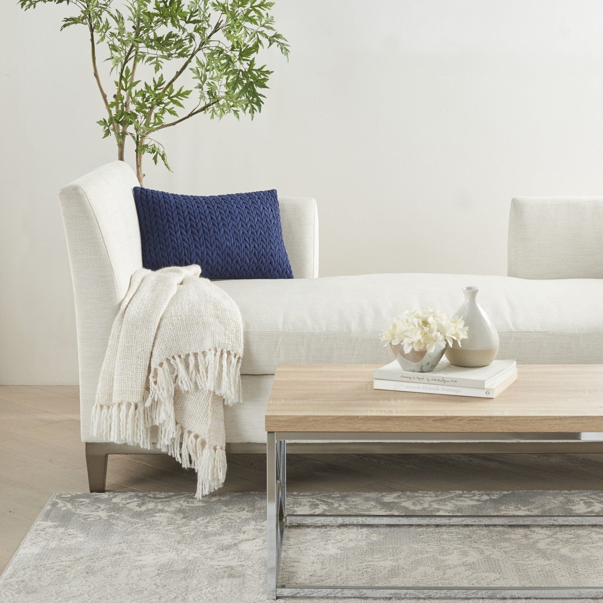 Invoke a sense of comfort, style, and elegance in your modern minimalistic decor with this trendy and soft solid Navy Blue Chunky Braid Lumbar Pillow. The braided front is essential in delivering a new layer to the whole experience. Whereas with the aid of the 100% cotton fabric, longevity and ease in cleaning are ensured. The bold navy blue color is meant to stand out among more neutral and soft colors giving the whole space a sleek and inviting look. Pursue new progressive and creative spaces with staying true to high quality with this elegant piece. 14” x 20”x 5"