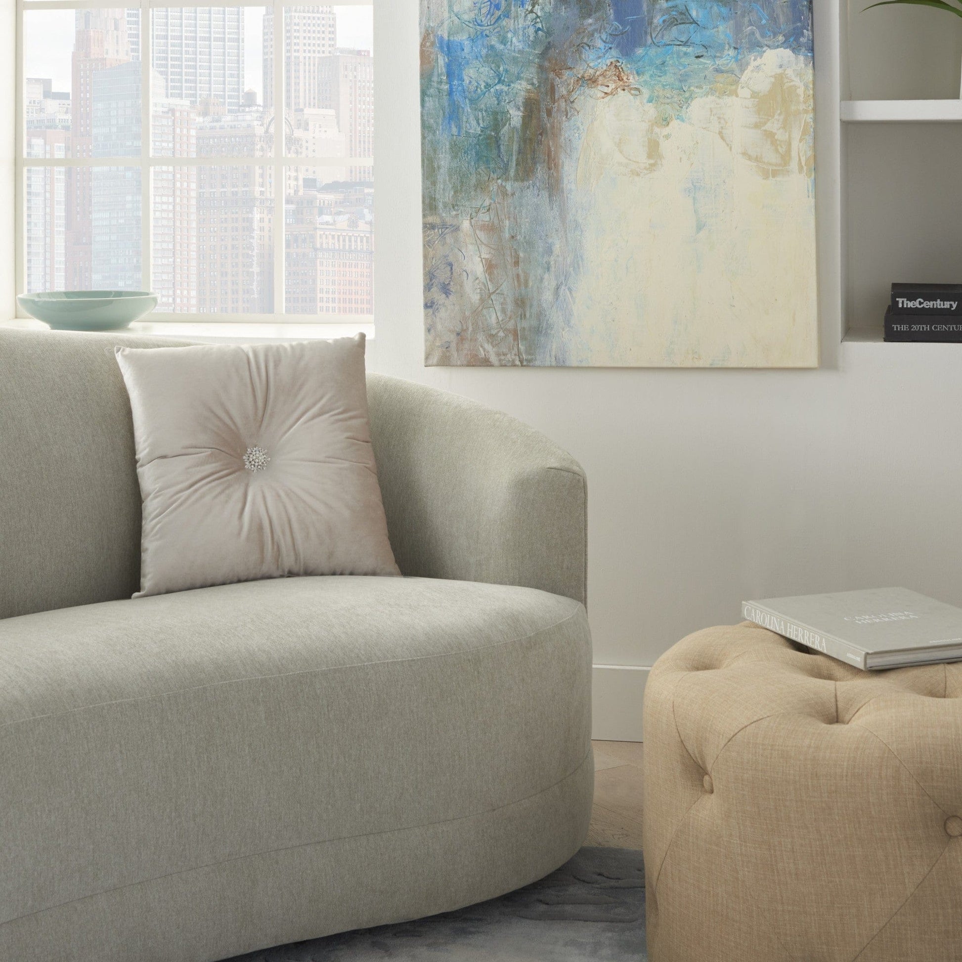 Make the most of your luxury aesthetic by adding this Off-White Embellished Throw Pillow to your seating spaces. This throw pillow has a square shape and is covered in a soft feel fabric in a stunning off-white color. The fabric has a slight sheen to it which is exaggerated by the beaded embellishment in the middle. The beaded design in the middle acts as the top of a tufted design and creates a nice textural feel. Use this throw pillow in your bedroom, your favorite chair, or class up your couch with it. 5" H x 18" W x 18" D