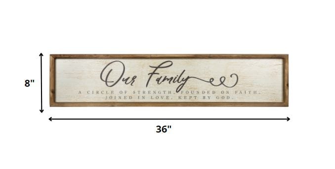 Imbibe the habit of appreciating your family life with this perfect work of art. The transitional art is artistically crafted with MDF and wood bearing an inscription Our Family. Add this piece to your gallery wall to complement your bedroom or living room decor. This wall art is handcrafted and it will perfectly collocate with other art pieces. Typography style 50%, MDF 50% wood Comes ready to hang Two D-rings hanging method Horizontal hanging orientation Wipe clean with damp cloth. It is 36" X 1" X 8".
