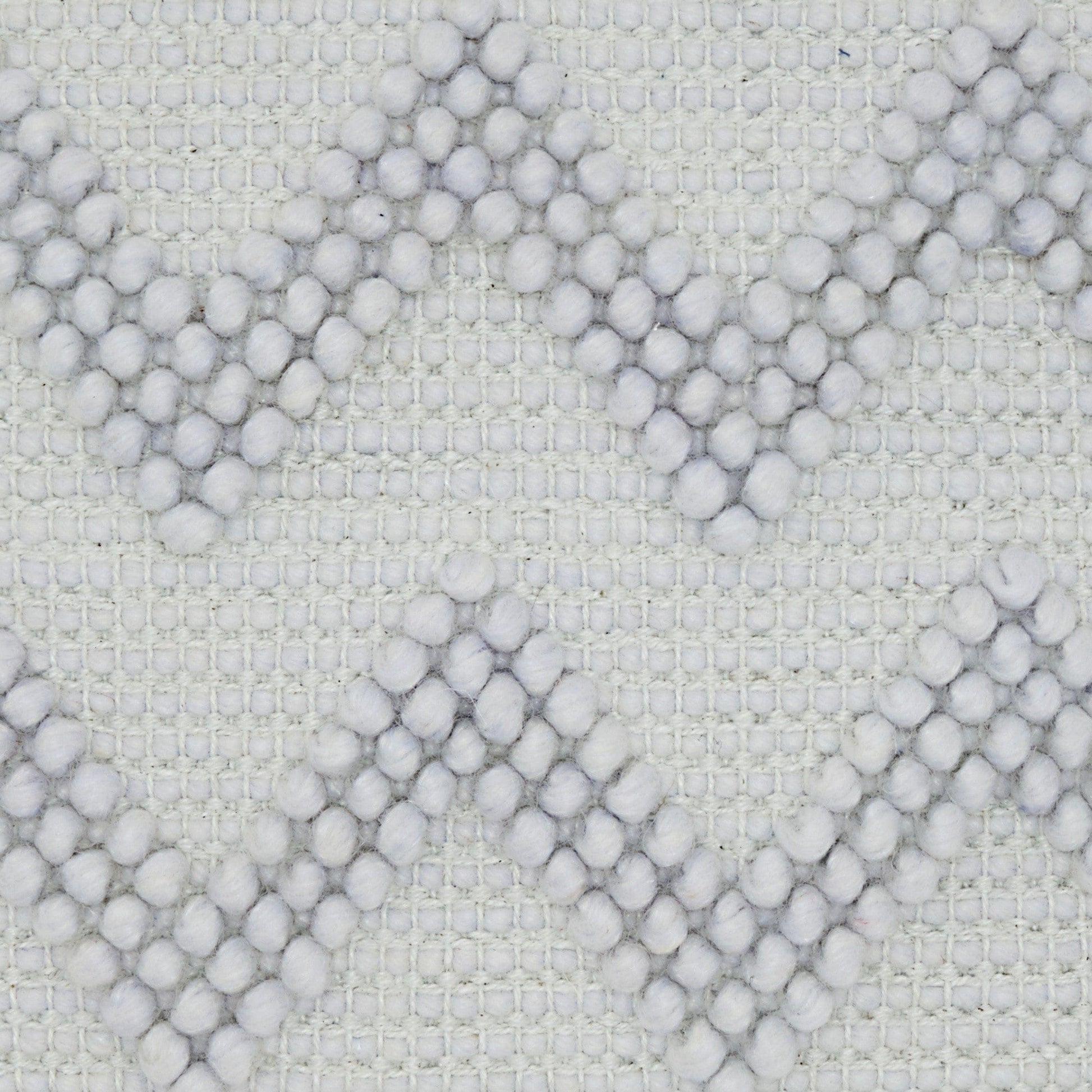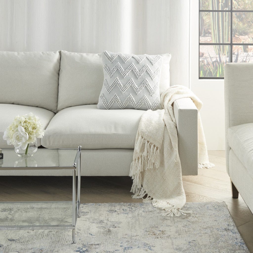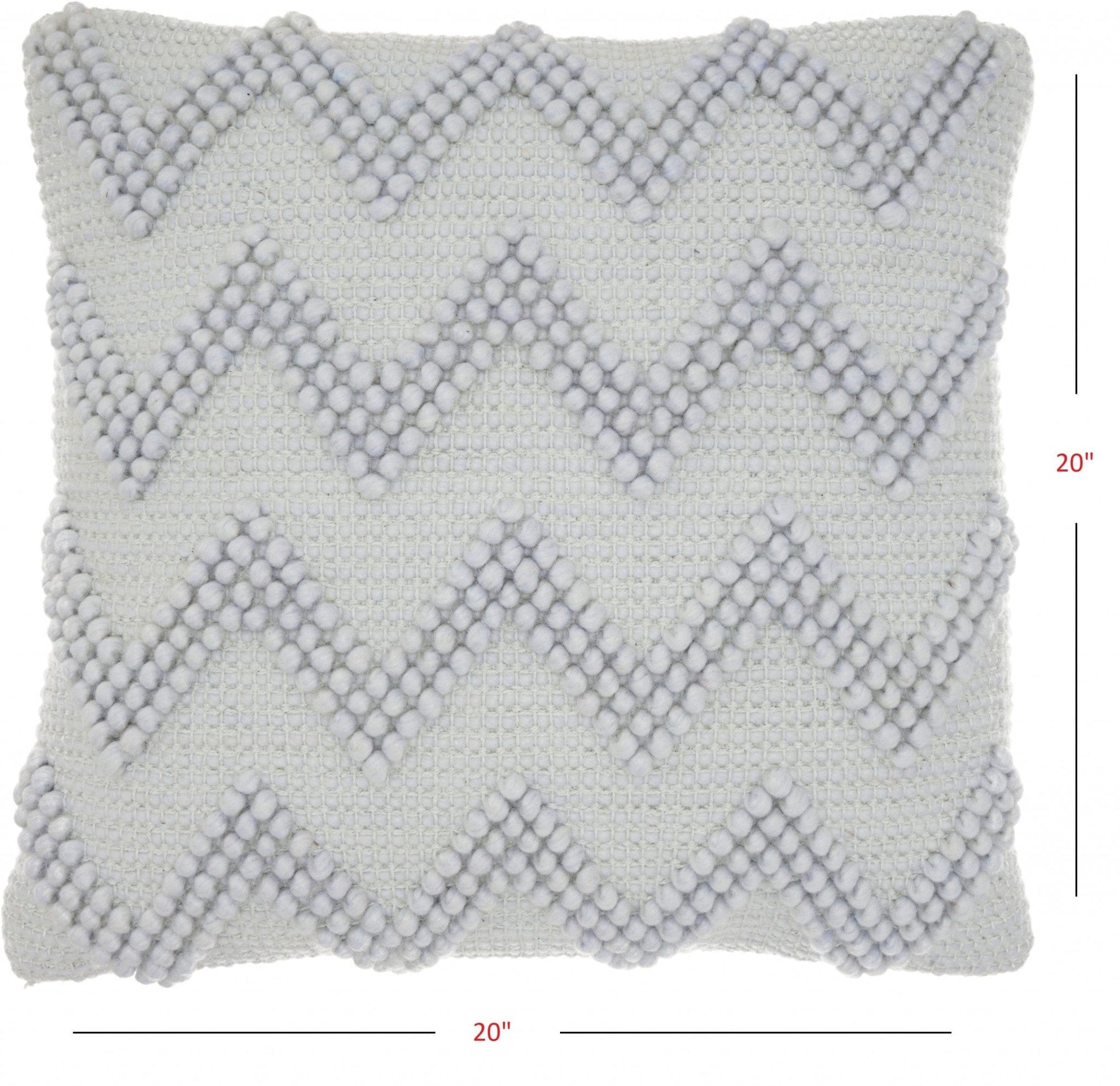 With this Pale Blue Chevron Detail Throw Pillow you can add the perfect finishing touch to your bed or your couch with a great combination of style and comfort. This pillow has a square shape and is covered in a textured pale blue colored fabric. This fabric serves as the perfect background for the detailed chevron pattern that is all along the front of this throw pillow. The chevron pattern is made of pale blue colored thread that is tightly wound in small circles. There are three layers of small circles in each of the chevron stripes which gives more depth and dimension to the overall look. This throw pillow will look great anywhere in your home and elevate the look of all the seating spaces you have. 6" H x 20" W x 20" D