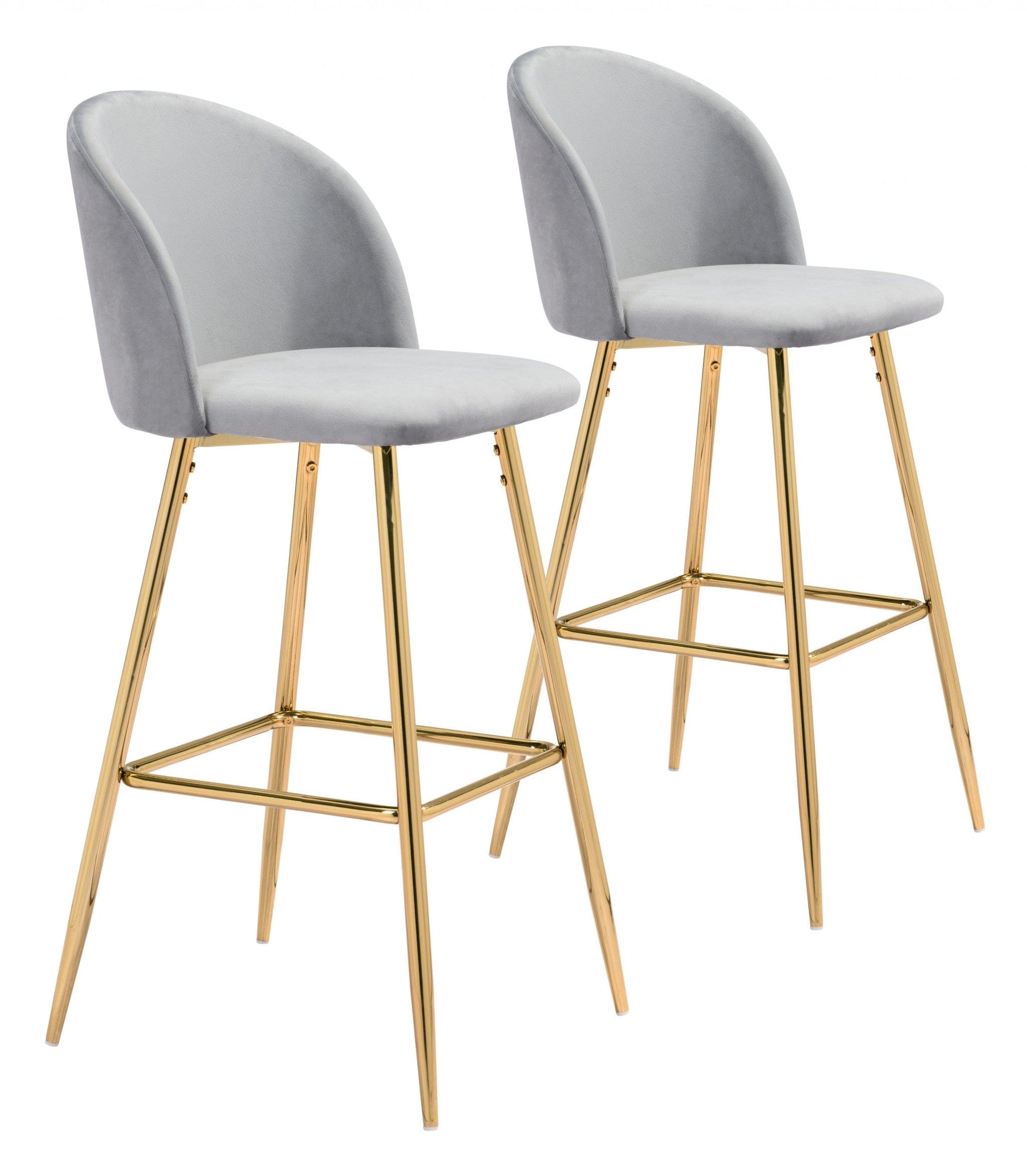 Update your space with a cool vibe from the Pale Gray and Gold Modern Pringle Bar Height Chair. This contemporary twist on a classic bar chair will leave you wanting more. The sturdy stainless steel base with a convenient four sided footrest comes in a rich gold tone finish. The seat with partial wrap around backrest in covered in a super and durable soft polyester that creates a striking contrast with the gold. 40.9" x 18.5" x 22.8"