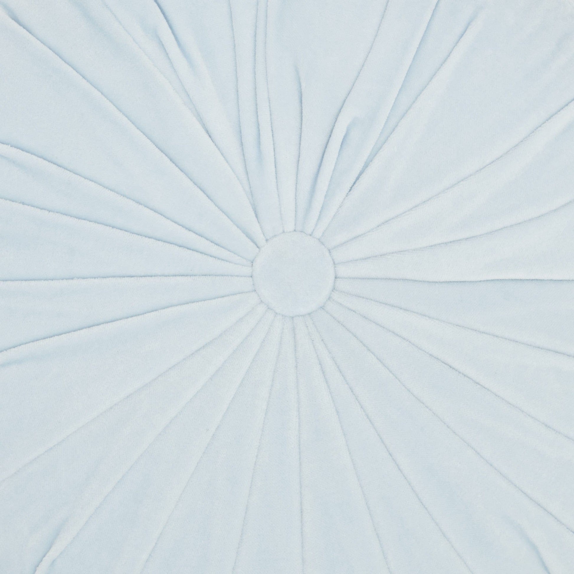 This Periwinkle Tufted Round Throw Pillow is the perfect way to add some unique design and comfort to your home. This pillow has a round shape and is covered in a stunning periwinkle colored fabric. This fabric has a very soft and velvety feel to it which adds to the comfort that this throw pillow provides. This pillow has tufting in the middle which gives it the pleated look and is completed by a periwinkle colored button holding it all together. This round throw pillow will add a nice depth to any pillow decor you have on your bed, on your couch or can be used as a stand alone pillow on your favorite chair as well. 5" H x 16" W x 16" D