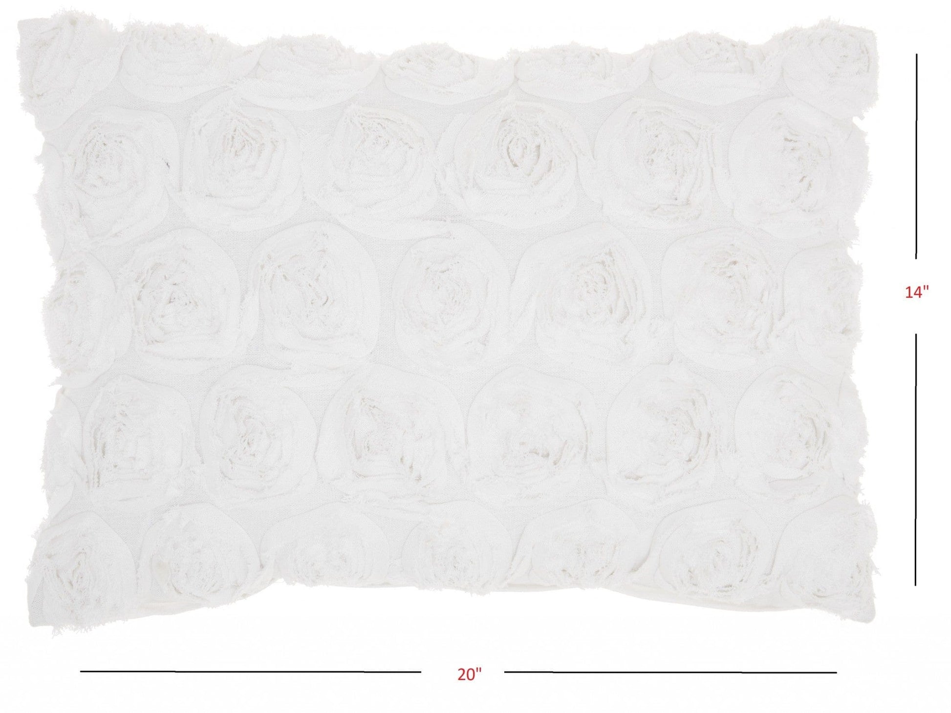 This Petite White Embossed Rose Lumbar Pillow is the perfect combination of minimal design and comfort and will elevate the look of your seating spaces. This pillow has a narrow rectangular shape and is covered in a smooth white colored fabric. There is a hidden zip closure at the back which gives a very seamless look to this pillow. On top of the white background, loose rose shapes cover the whole front side of the pillow. These rose shapes have an embossed feel to them and are made from the same fabric in a circular weave. You can use this throw pillow anywhere in your home, on your bed, on your couch, and even on your favorite chair. 5" H x 14" W x 20" D