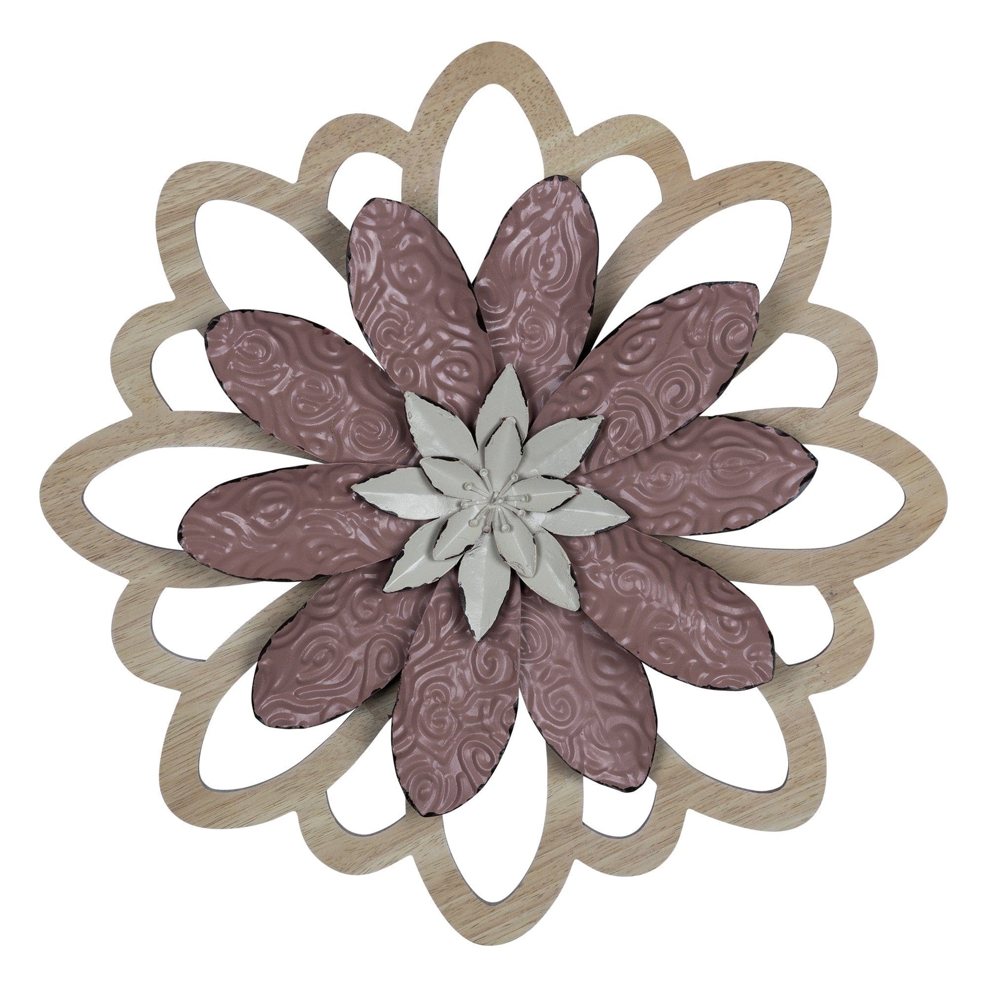 Bring in some floral contemporary design to the walls in your home with this Pink Embossed Floral Wall Decor. This decor piece is made from a mix of wood and metal. The outside floral border has a see through design and is made from wood. The wood has a light brown varnish on top and rounded off design to the petals. On top the wooden border, there are two metal flowers. There is one pink patterned metal flower on top of which there is a beige metal flower with pointed edges. This gives this whole piece a 3D feel which in turn will add depth and dimension to your wall. This is not only great for your home but will also make a great gift for friends and a family. 16" H x 16" W x 1.5" D