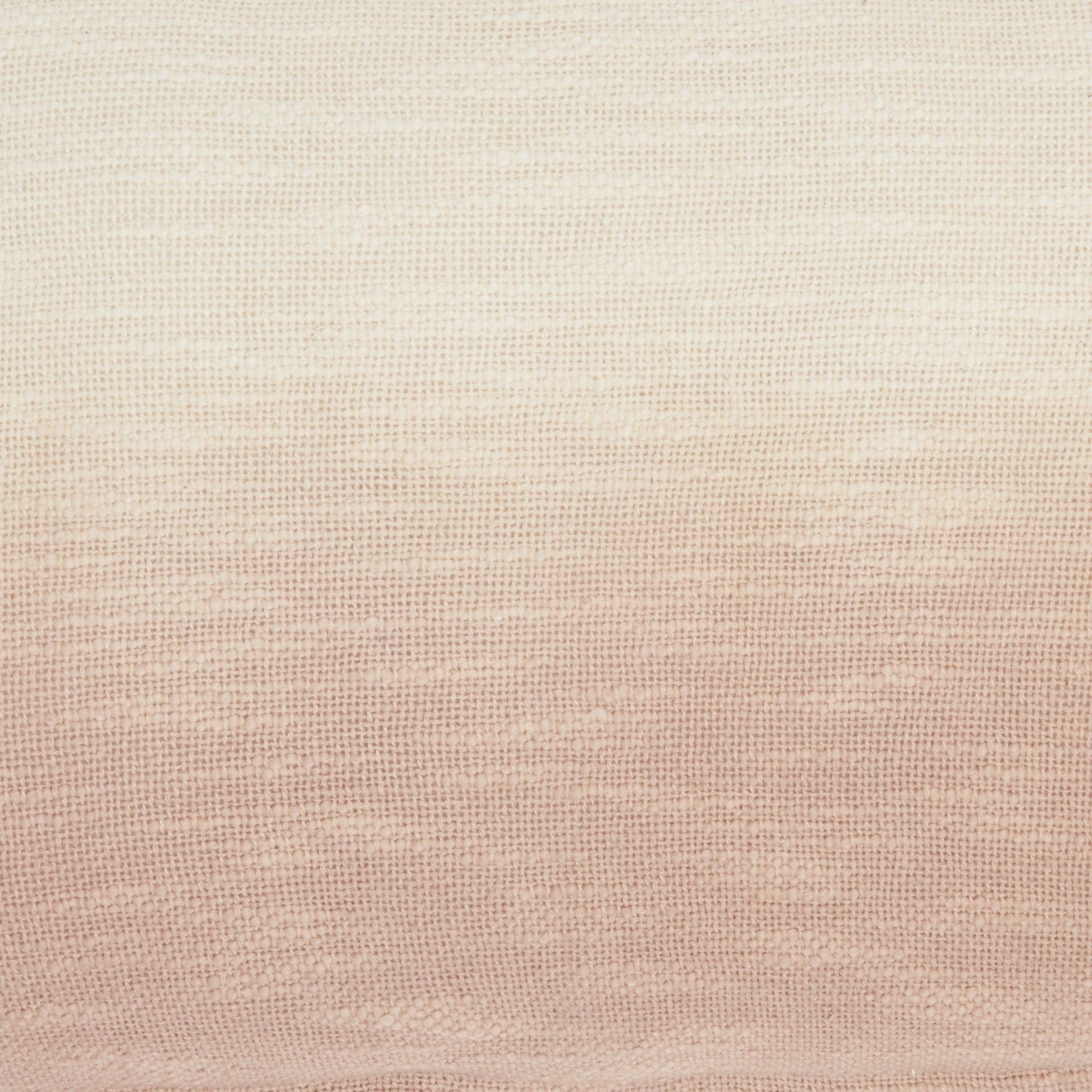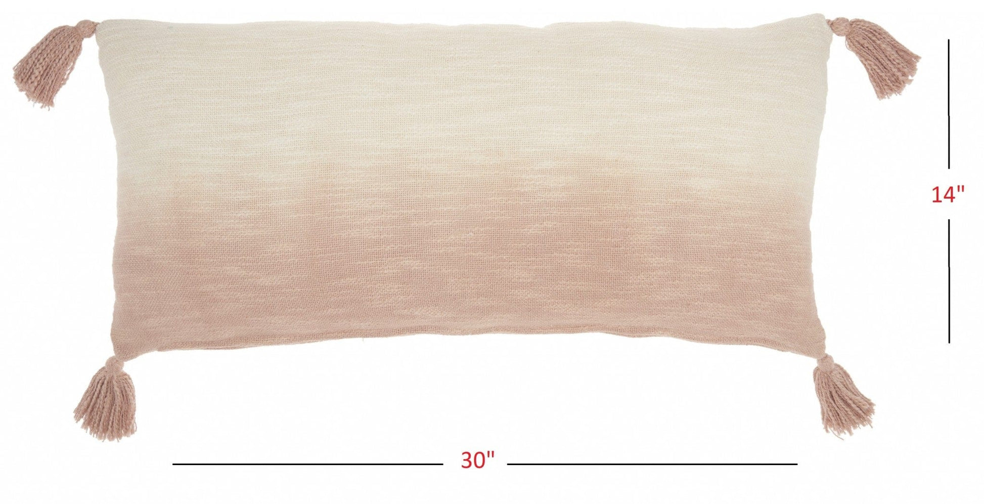 This Pink Ombre Tasseled Lumbar Pillow will help you bring a pop of color to any seating space in your home. This pillow has a rectangular shape with straight edges and a fluffy body. The pillow is covered in an ombre patterned fabric with a pink and white colorway. The bottom half starts off as pink and seamlessly transitions into the white colored top. At the four corners there are four pink tassels that add a touch of texture to the overall look of this pillow. The minimal design of this pillow allows you to use on your bed, on your couch, or any other chair you have in your home and make it that much more stylish and comfortable. 5" H x 14" W x 30" D