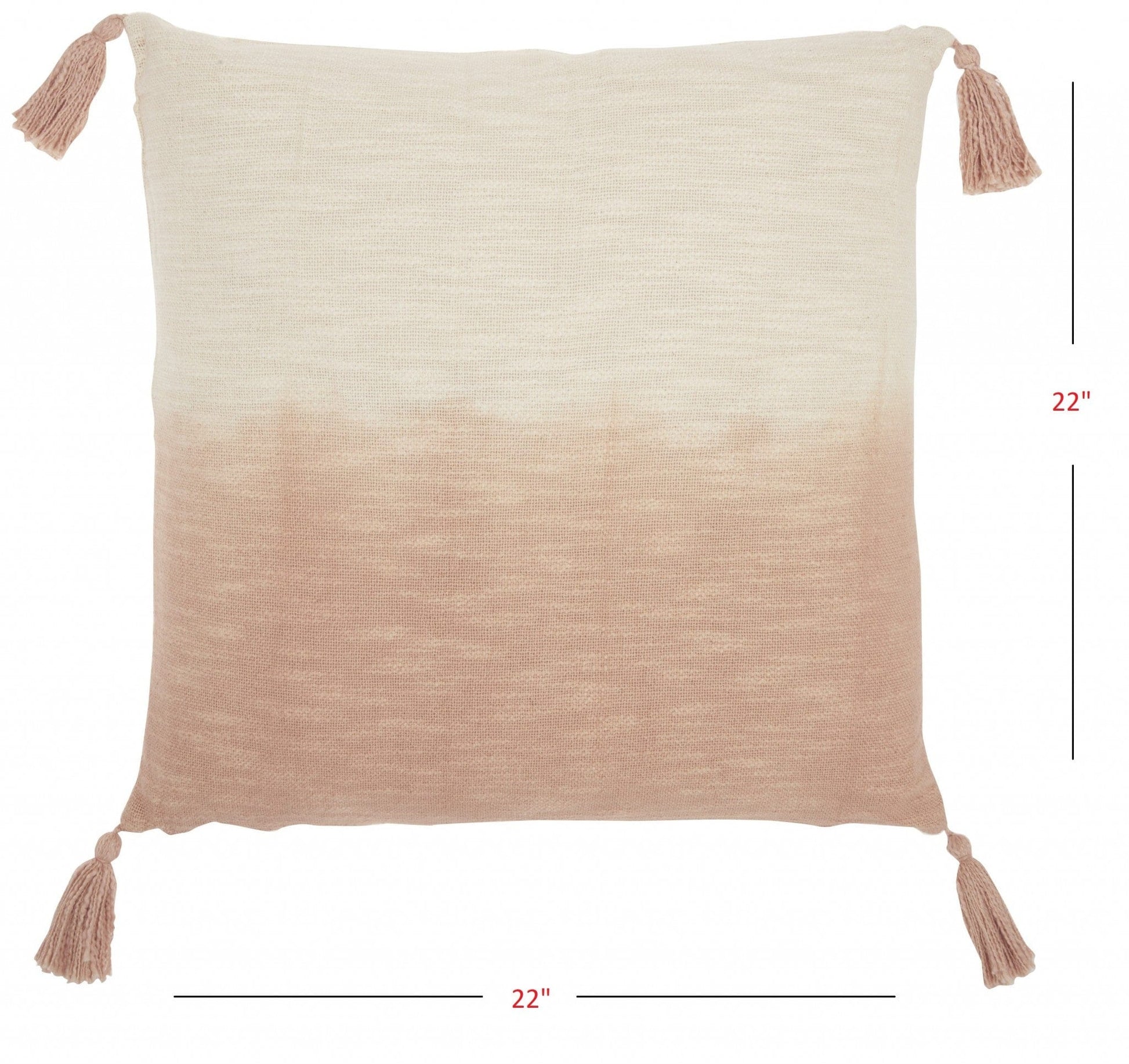 This Pink Ombre Tasseled Throw Pillow will help you bring a pop of color to any seating space in your home. This pillow has a square shape with straight edges and fluffy body. The pillow is covered in an ombre patterned fabric with a pink and white colorway. The bottom half starts off as pink and seamlessly transitions into the white colored top. At the four corners there four pink tassels that add a touch of texture to the overall look of this pillow. The minimal design of this pillow allows you to use on your bed, on your couch, or any other chair you have in your home and make it that much more stylish and comfortable. 5" H x 22" W x 22" D