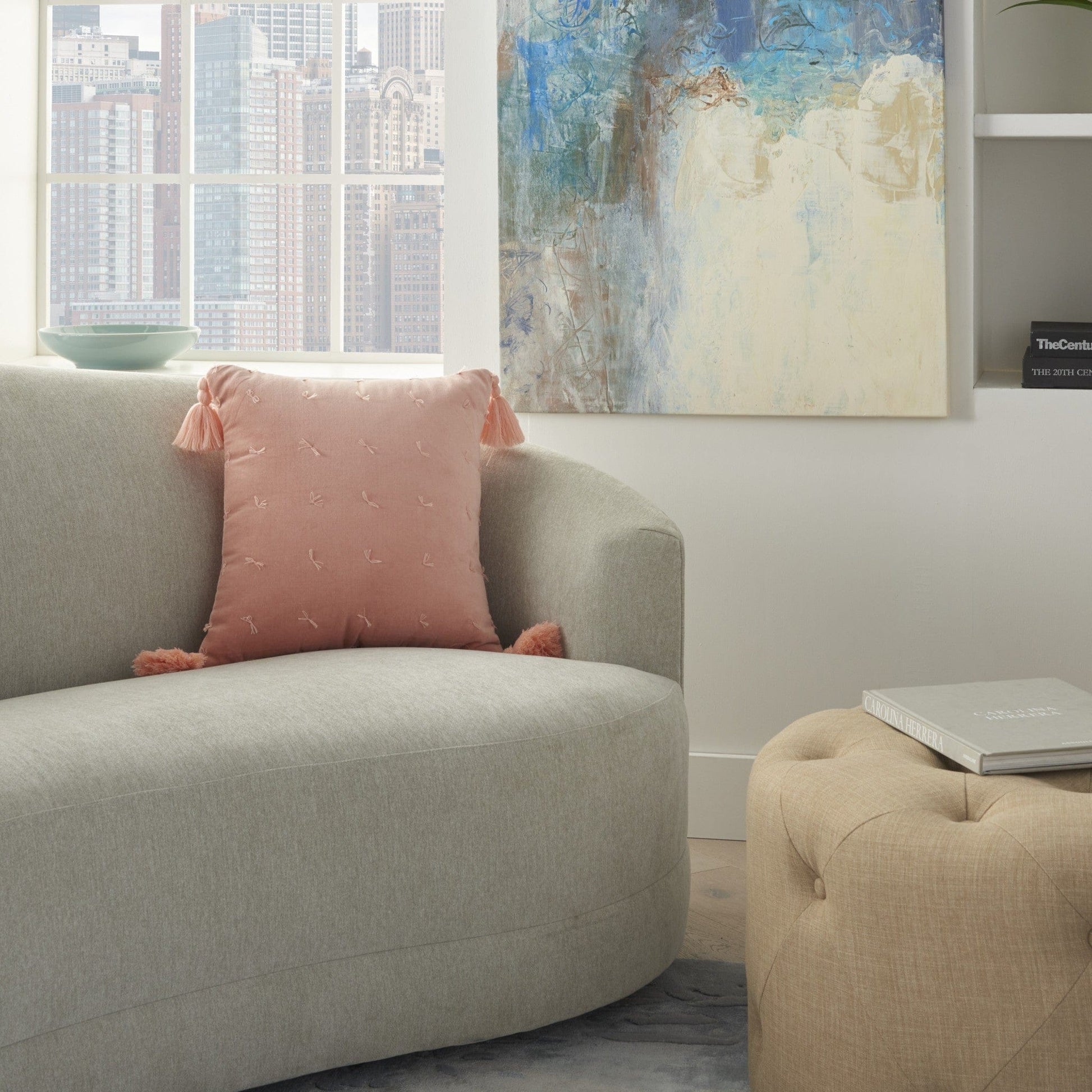 With this Pink Thread Detailed Throw Pillow you can add the perfect combination of comfort and style to any seating space in your home. This pillow has a square shape with a robust body and curved edges. The fabric is soft to touch and smooth in a very pretty pink color. On top of this pink background there are equally spaced out thread details that add texture to the overall look of this pillow. At the four corners there bound tassels in the same pink color. This pillow can be used anywhere in your home to elevate the look of your bed, your couch, or any other seating area you may have. 5" H x 18" W x 18" D