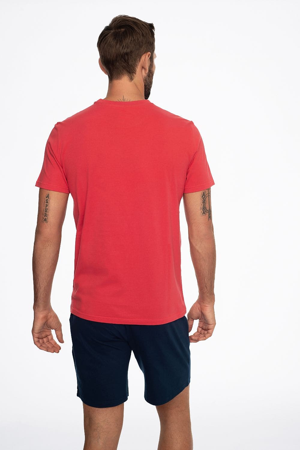 Men's Creed pajamas are a sporty sleep set that consists of a simple T-shirt and shorts. The red short-sleeved T-shirt is decorated with a large inscription. Its color contrasts interestingly with the solid dark shorts. In addition, the soft knit fabric does not restrict movement and is nice to the skin. This two-piece nightwear set, thanks to its loose cut, will keep you comfortable all night long.