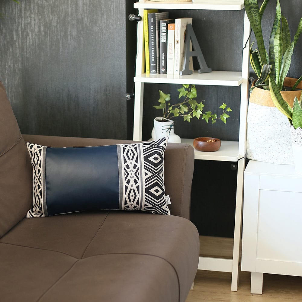 Rectangular Spruce Blue Faux Leather And Geometric Pattern Lumbar Pillow Cover